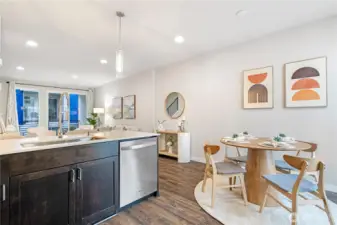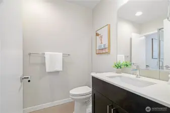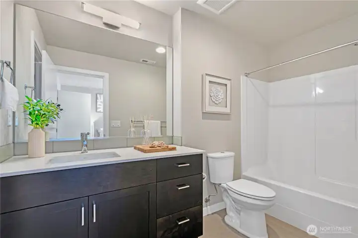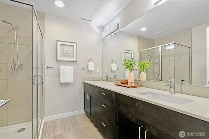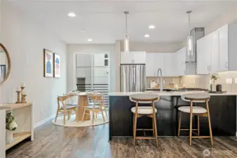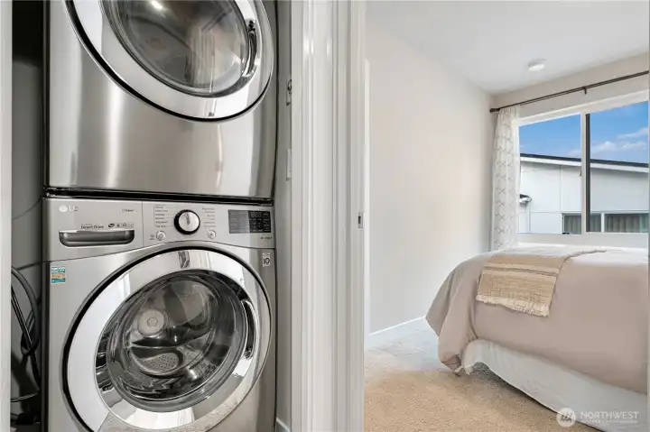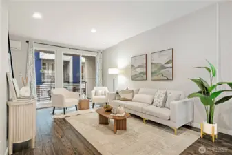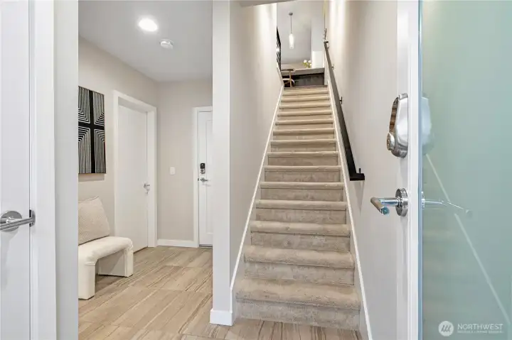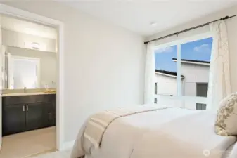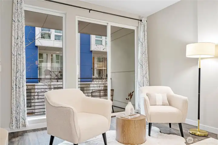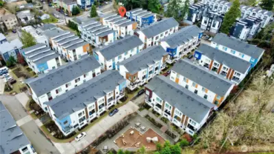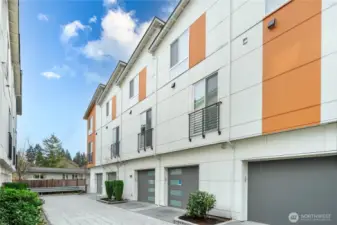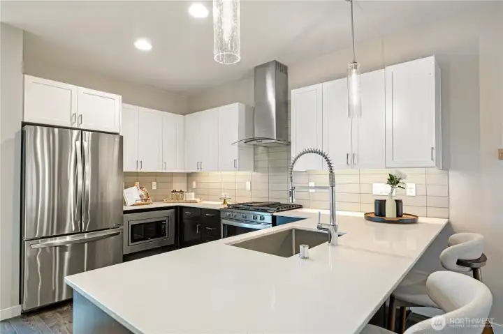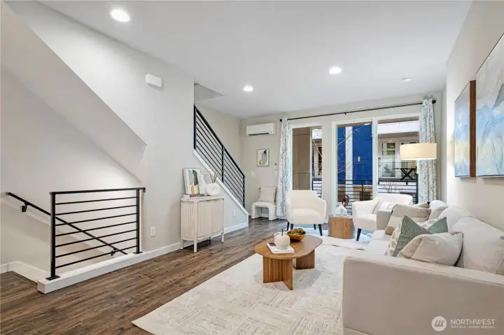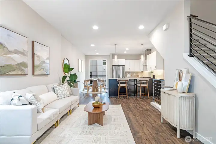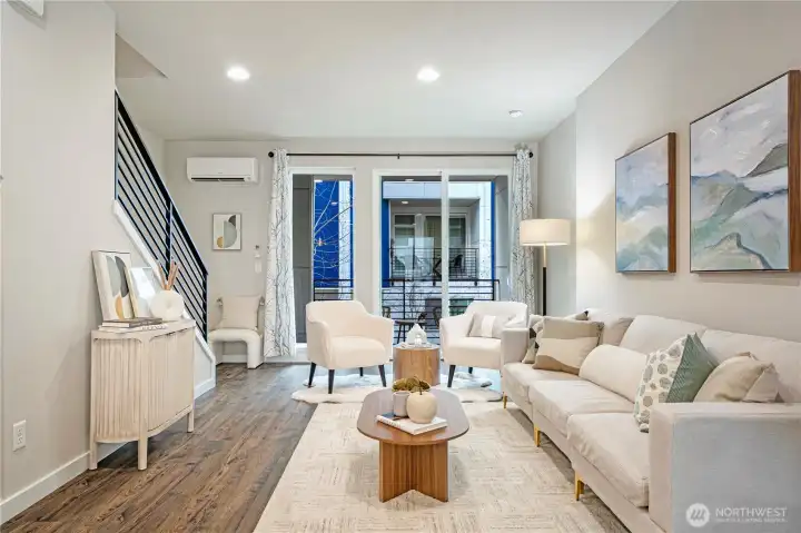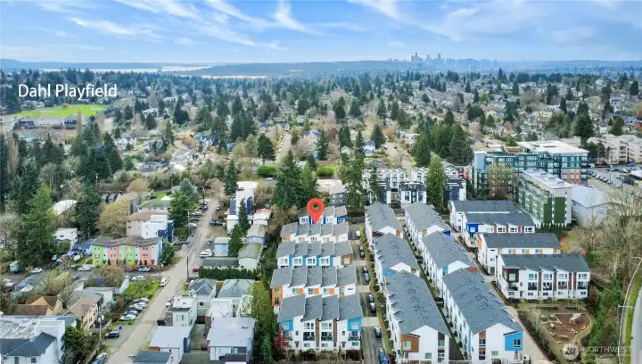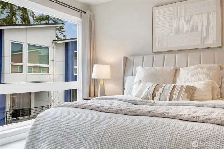 Amazing floorplan in the best location of the Ravenna 88 community, quietly set away from Lake City Way. Two parking spots are guaranteed! Cozy south–north facing home featuring large floor-to-ceiling windows that flood the space with abundant natural light throughout the day. Contemporary design includes white cabinetry, quartz countertops, glass tile backsplashes, stainless steel appliances, sleek metal railings, hardwood floors, and a spacious covered balcony. The lower-level bedroom and bath are perfect for guests or a home office. The main level offers a generous kitchen and dining area ideal for entertaining. Upstairs, two en-suite bedrooms are bathed in natural light from oversized windows, creating bright and inviting retreats. The extra-wide one-car garage provides ample storage, with abundant guest parking conveniently located just behind the unit. Unbeatable access to major commuter routes and public transportation. Just minutes to Green Lake, Roosevelt Light Rail Station, Magnuson Park, and UW, and only 10 minutes to Downtown Seattle and SLU. No rental cap—an excellent opportunity for both first-time buyers and investors.