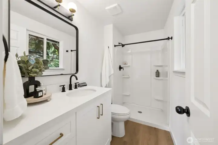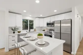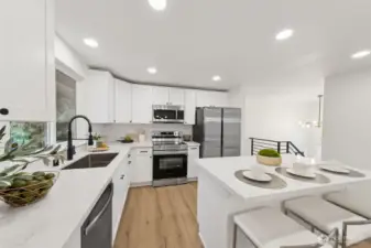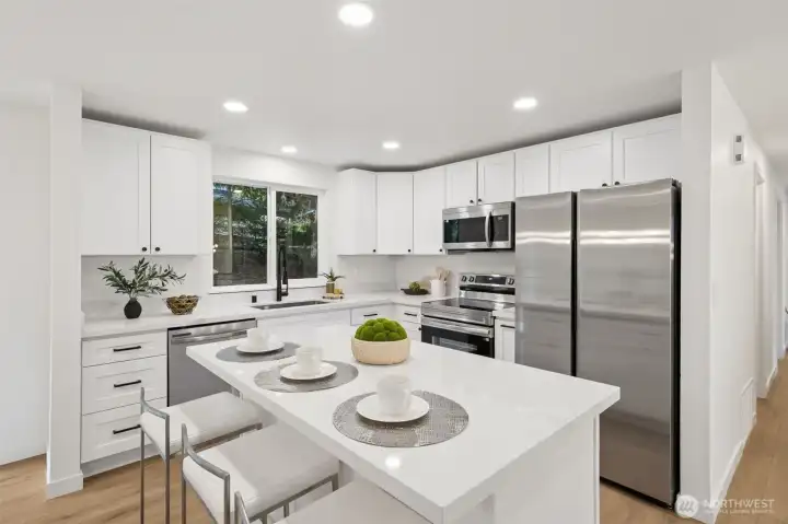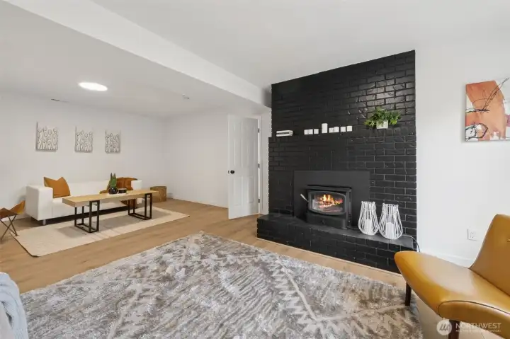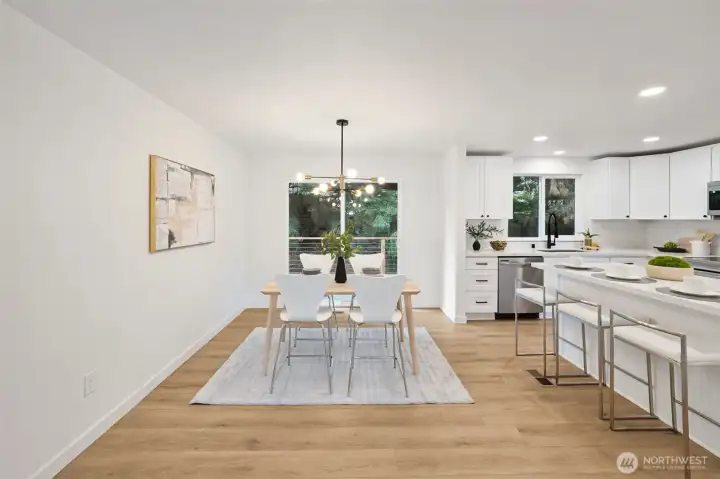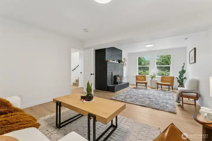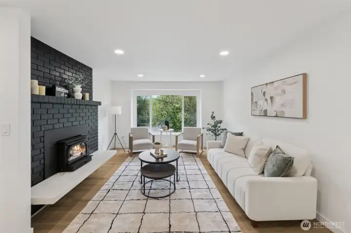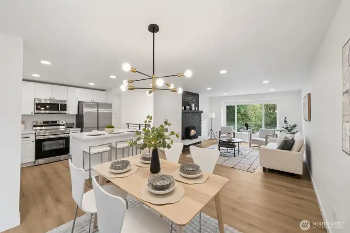 This stunning gallery-style home offers 1,772 sq ft of beautifully redesigned living space! Upstairs features a chef’s kitchen with ample counter space, upgraded cabinets, and a large island with bar seating. The spacious living room boasts a charming wood-burning fireplace, and the light-filled dining area opens to a huge deck. Three bedrooms include a luxurious primary suite. Downstairs showcases a spectacular rec room—perfect for entertaining or movie nights! Set on a 1/3-acre lot with extensive renovations: new roof, windows, paint, flooring, baths, kitchen, water heater, fixtures, doors & millwork!