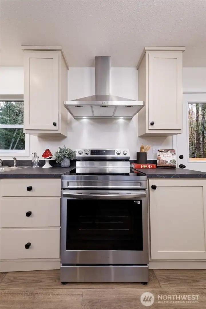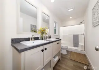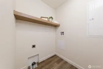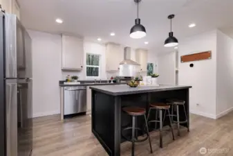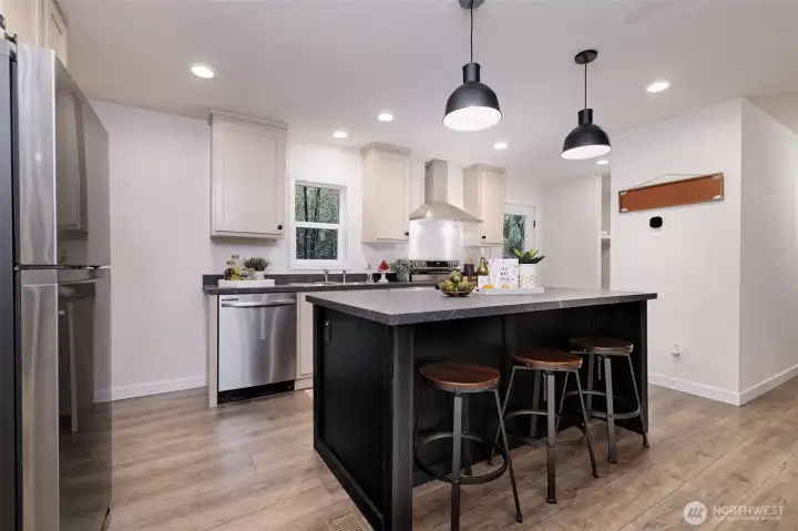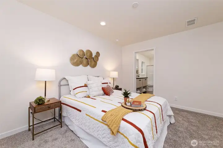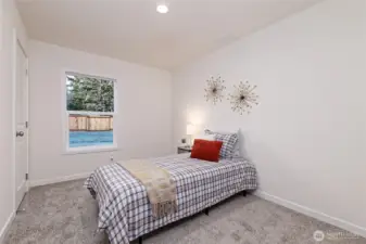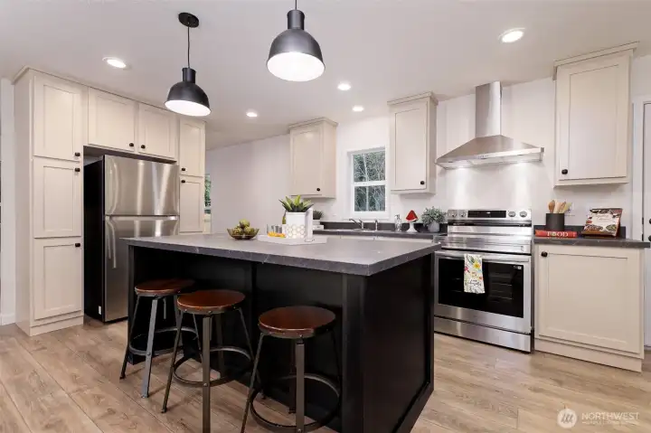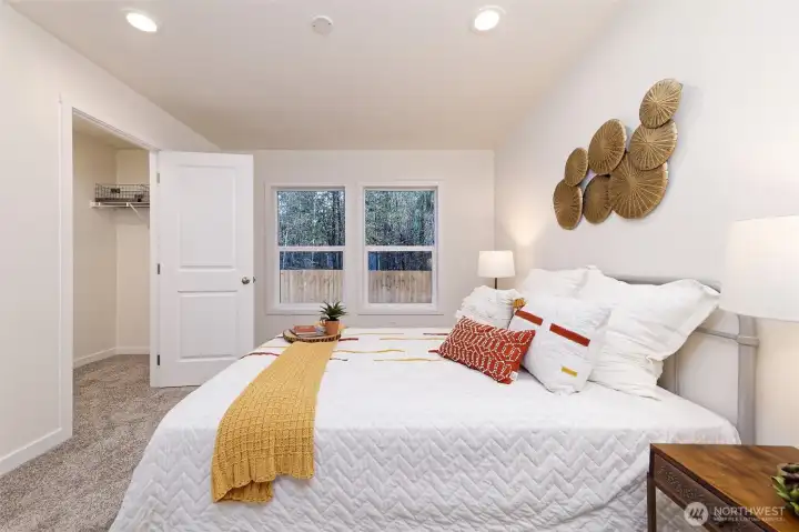 Discover this charming, newly constructed corner lot home at Lakeshore & Annas! Featuring 1,344 sq ft of living space. This property provides ample yard space, privately fenced backyard. Enjoy this corner lot with only one neighbor behind and adjacent to a green belt. This NEEM-certified residence includes stainless steel appliances and boasts a built-in covered front porch with Trex decking. The upgraded midnight package features an accent batten and board wall in the living room, along with stylish black pendant lights over the kitchen island. With 3 bedrooms, 2 baths, a walk-in master closet, private community boat launch to Puget sound and lake, private community parks, RV Parking, and the home combines comfort and modernity perfectly!