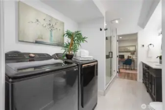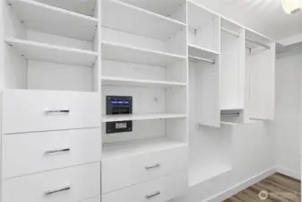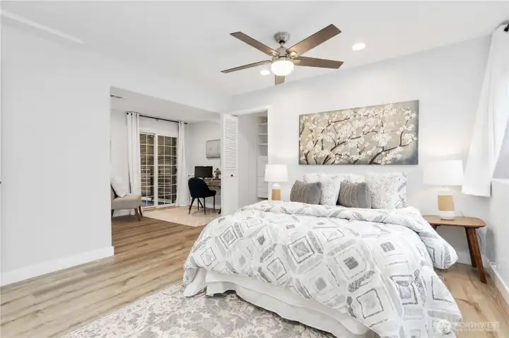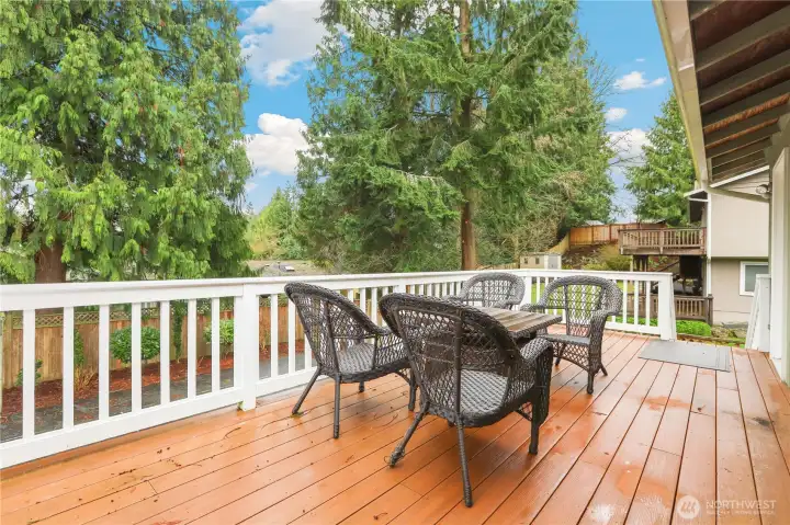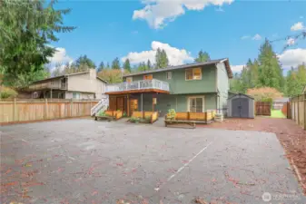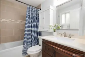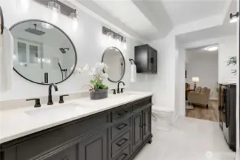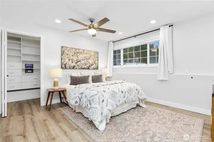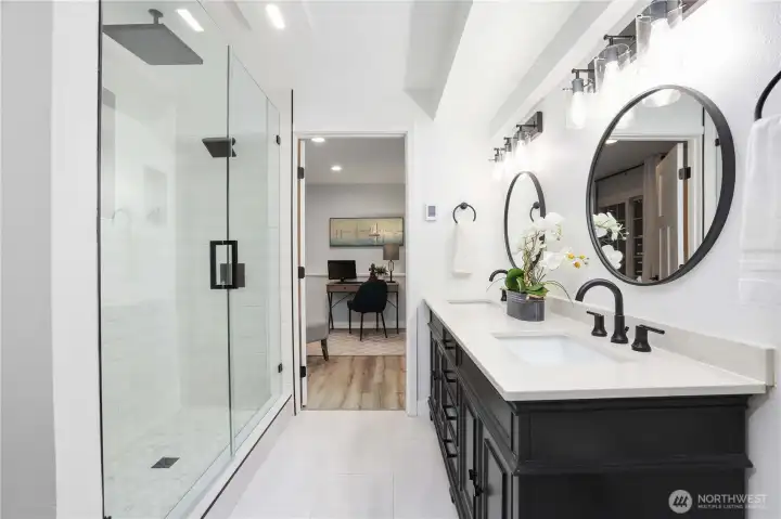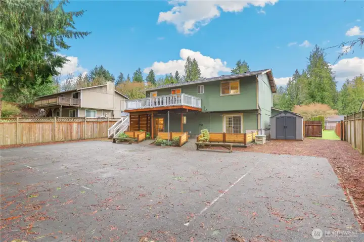 Look no further! This open floor plan is complemented by stylish flooring across the upper level and a stunning kitchen featuring stainless steel appliances, soft-close drawers and doors, quartz countertops, and a sleek glass tile backsplash. The dining area opens to a spacious 10'x20' deck with a gas line ready for grilling—ideal for gatherings. The living room offers a cozy gas fireplace with custom built-in shelving. Upstairs includes a secondary primary bedroom with a full bath, plus an additional full bath finished with travertine walls. The lower level features updated flooring and a spacious main primary suite with a fully remodeled bath showcasing quartz surfaces, heated tile floors, a walk-in shower with dual rain shower heads, and a walk-in closet. A large family room or extra bedroom, California Closets in every bedroom, a private sport court, and no HOA dues complete this exceptional property. RV or boat parking. Located minutes from Mill Creek Town Center and I-5 & I-405 freeways. Welcome home!