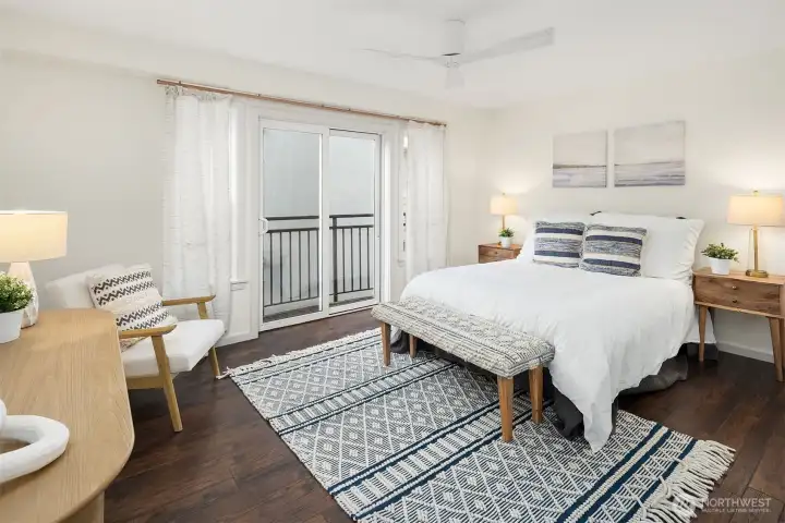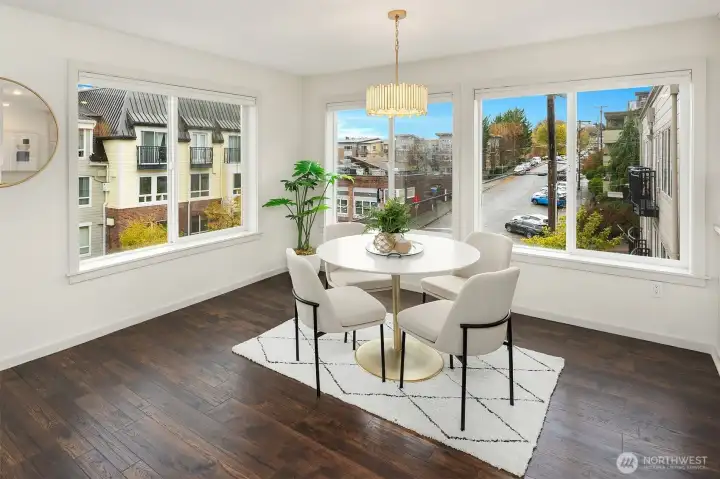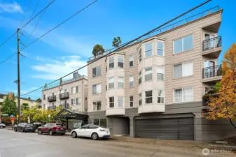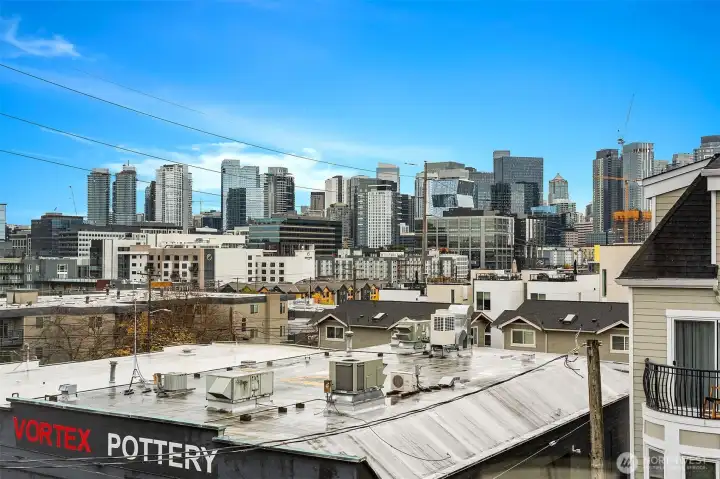 Spectacular, light-filled corner unit with sweeping downtown views in vibrant Lower Queen Anne. Large south-facing windows provide abundant natural light. Features two spacious bedrooms; the primary includes an ensuite bath and built-in closets. Both bathrooms have been tastefully updated. Enjoy heated floors throughout, new Low-E glass, and a full-size washer/dryer. Includes two secure parking spaces, bike storage, and a private storage unit. Steps to cafes, restaurants, grocery stores, Seattle Center, and Lake Union. Close to SLU and offices for Amazon, Google & Meta. Well-funded HOA.
