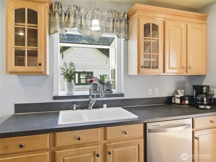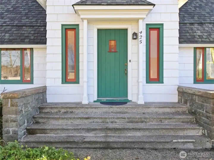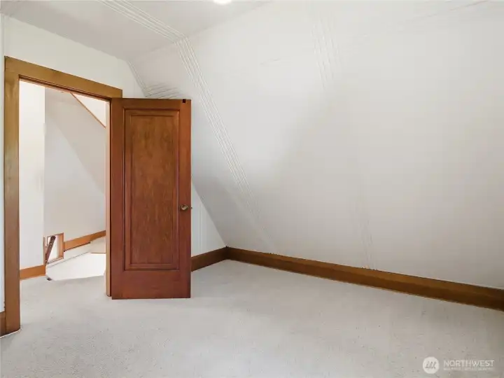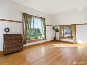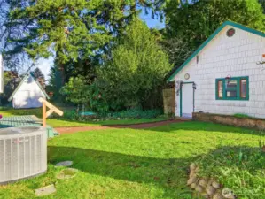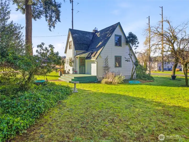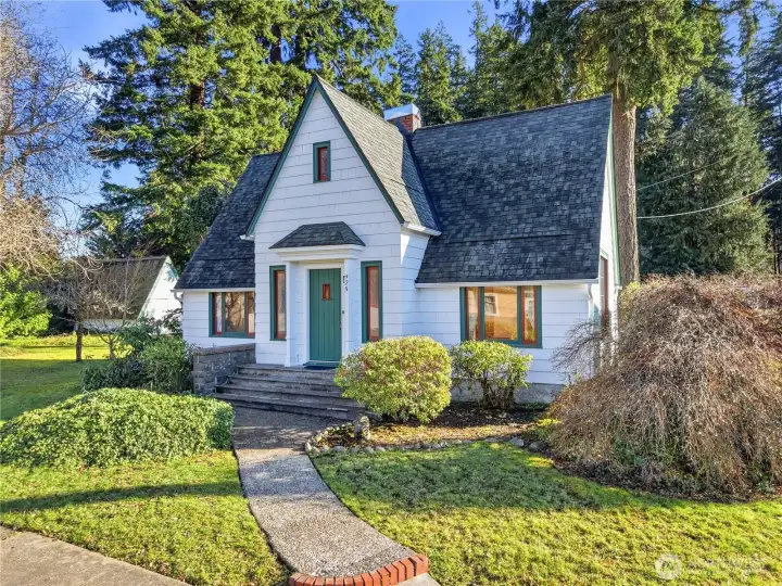 ~ Own a piece of Washington History! ~Distinct, 20th-century craftsmanship, Storybook-English Cottage–. _Rare to the community, original owner/builder, Don Major, ‘Wooden Money’ creator/printer of 1931._ --Enter into this Home, which has never been on the market before!- Find cathedral ceilings throughout, boasting natural light, original wood floors, and solid wood doors that cascade through most of the home, with carpet on the second floor._ +Roof installed in 2014, newer exterior paint, fresh paint on the main floor, living room with gas fireplace, sandstone entry, main floor bedroom, updated kitchen, commercial-grade Corian flooring, updated bathroom, upper-level bedroom plus additional office or flex (WFH). Electric furnace and heat pump for efficient heating and cooling! --Partial basement providing storage, laundry, and utility space, custom laundry chute, original coal chute preserved as a unique historic feature. Situated on a corner, double lot—rare for a downtown location with mature trees and landscaping, fit for a park! Detached two-car garage plus workstation, with SEPARATE gas furnace, work in the comfort of a heated garage! The garage attic provides storage, an additional garden shed for tools, and a mower.