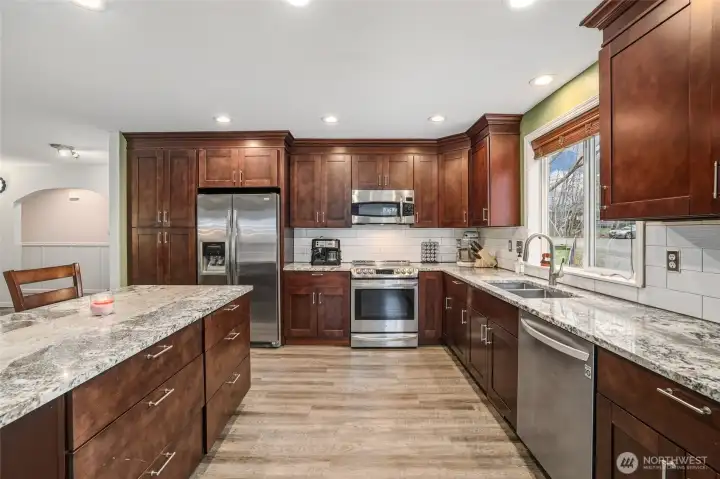 Beautiful Home tucked away on a quiet cul-de-sac in the Desirable Edgewood area! This well-designed, updated 3 bed/2 bath rambler showcases true pride of ownership throughout. The great floor plan features a large open kitchen with lots of counter space and a fantastic island that flows seamlessly into the living areas, making it ideal for both everyday living and entertaining. Light and bright formal living/dining with spacious tall ceilings. Enjoy working from home in the dedicated office, relaxing on the expansive covered deck and taking in the beautifully manicured yard. An Amazing Large Detached shop, RV parking, tons of storage and thoughtful upkeep make this home as functional as it is inviting. Convenient location! A must see!