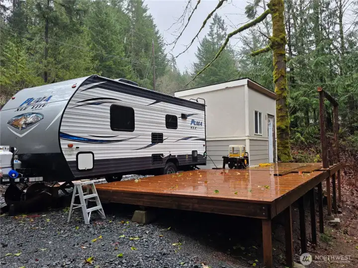 Come relax in this cozy spot at the base of the Olympic Mountains with a Puma XLE Lite camper all set up. This property also has a storage shed, a newly built deck and the ability to connect to the community water system. Power box has been installed and is nearly ready to activate. Included in the ownership is access to a community river park on the Dosewallips River.