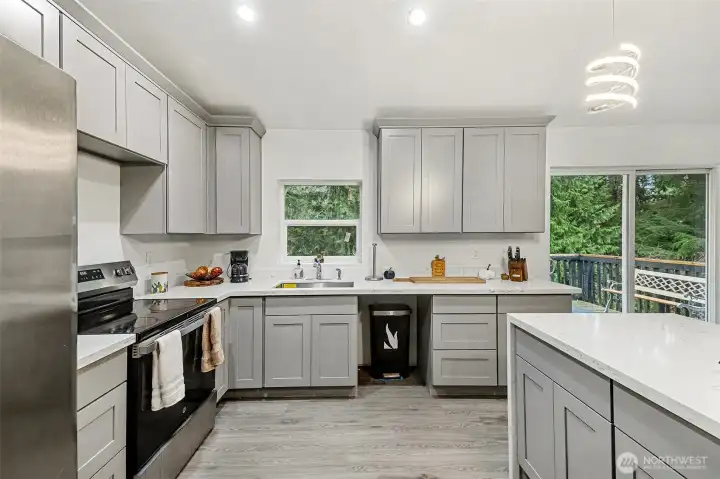 Tucked away at the end of a quiet cul-de-sac and surrounded by trees, this peaceful home offers comfort and privacy. Laminate floors and vaulted ceilings enhance the bright, open living spaces. The living room features a gas fireplace with a charming shiplap mantle, while the dining room opens directly onto the deckâperfect for indoor-outdoor living. The kitchen boasts new, rich cabinetry and a center island. The primary suite includes a full ensuite bath and a walk-in closet with an extensive closet system. Gas hot water and fireplace add efficiency and comfort. Low maintenance and move-in ready, the home also offer a grassy backyard with a path leading into the woods. Enjoy true tranquility and privacy next to acres of forest.