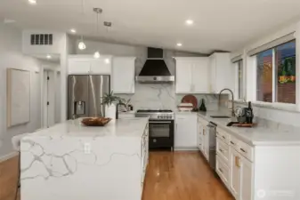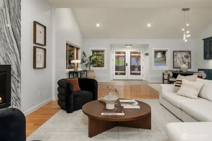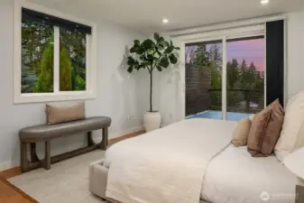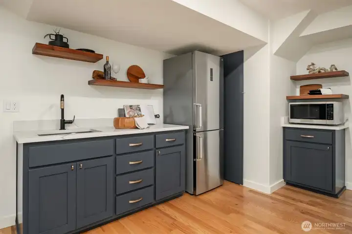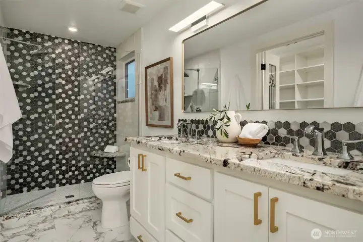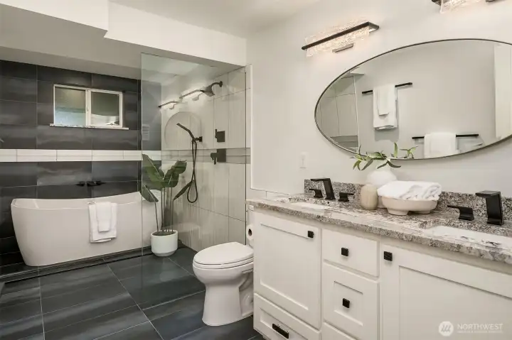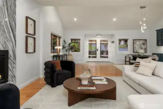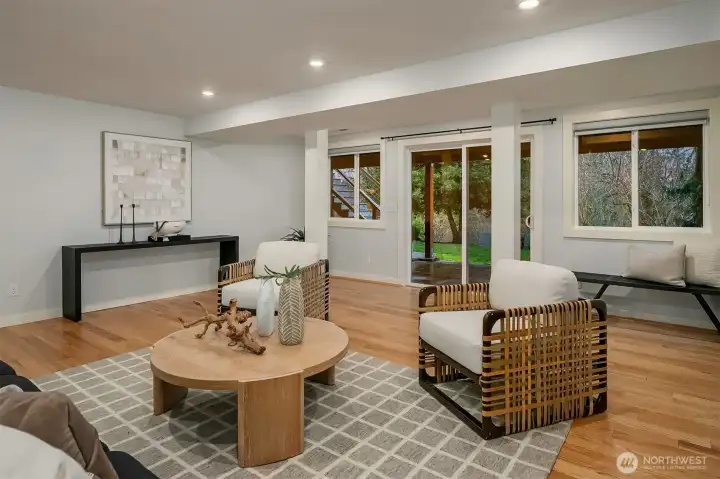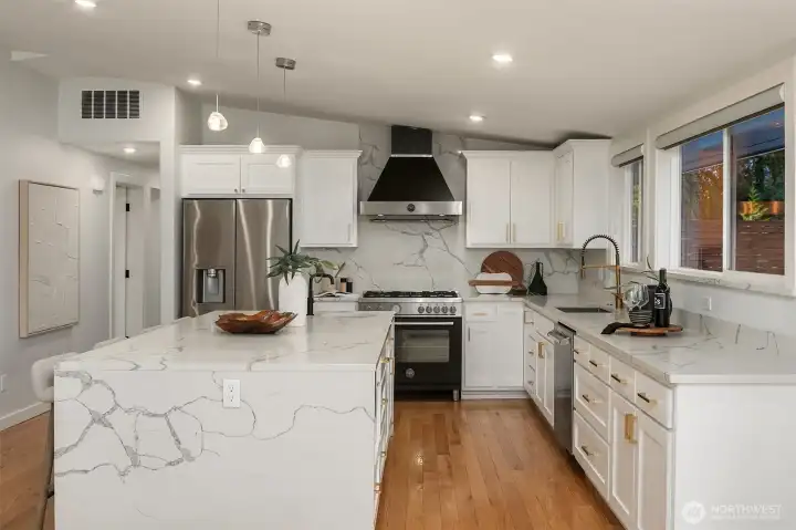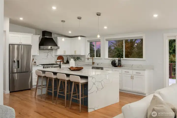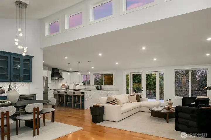 Introducing a fully reimagined North Rose Hill home rebuilt to the studs in 2020. Vaulted ceilings & transom windows fill the open great room with natural light, anchored by a dramatic granite-slab gas fireplace. French doors open to a massive deck spanning the width of the home & overlooking a lush, private backyard. The chef’s kitchen delivers both style & performance, centered around a double waterfall quartz island, Bertazzoni appliance package, & generous under-island storage, flowing to the dining space with custom built-in hutch & wine fridge. 2 main-level beds, including a primary suite with more deck access, blackout shades, & renovated bath with walk-in closet. Lower level opens to a kitchenette, rec room with fireplace, 2 beds, spa-style wet room, and a backyard with patio. Updated systems, hardwood flooring, solar panels, 2-car garage with EV charging, & wiring for generator complete this home.
