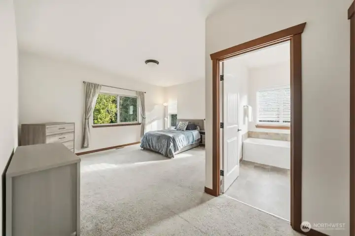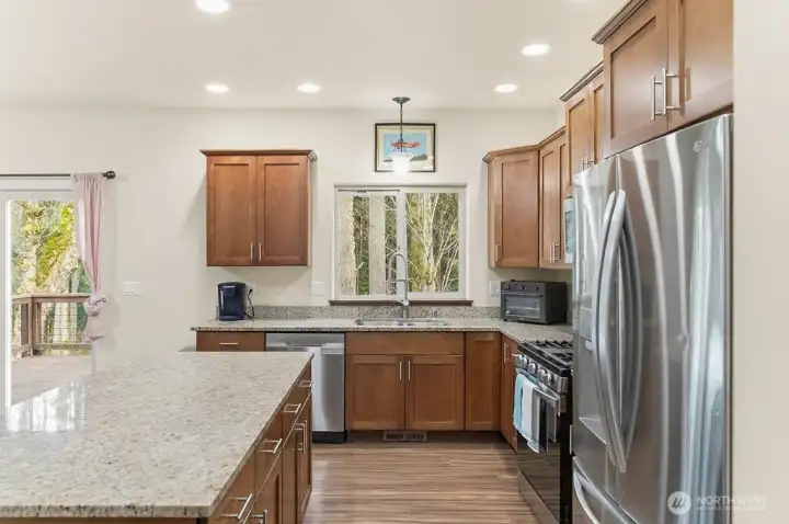 Welcome home to Poulsbo! Enjoy the spacious comfort of this two-story house offering 2,680 square feet of finished living space. Built in 2018, this home is designed for flexibility and function, featuring four bedrooms, a massive multipurpose bonus room, an office, and 2.5 bathrooms. The main-floor primary bedroom includes an ensuite with dual sinks and a soaking tub, as well as a walk-in closet. The kitchen shines with granite countertops, an ample center island, dual basin sink, a gas range, and plenty of storage space including a pantry. An open floor plan connects the dining and living areas, highlighted by both a cozy gas fireplace and beautiful views from the attached deck facing neighborhood wildlife. The first floor also incorporates a charming front office and guest bath. Upstairs provides three additional bedrooms, two of which include walk-in closets, a sprawling bonus room, and a full bath. Natural gas, air conditioning, and a two-car garage complete this inviting home in one of Poulsbo's burgeoning neighborhoods, just minutes from downtown.
