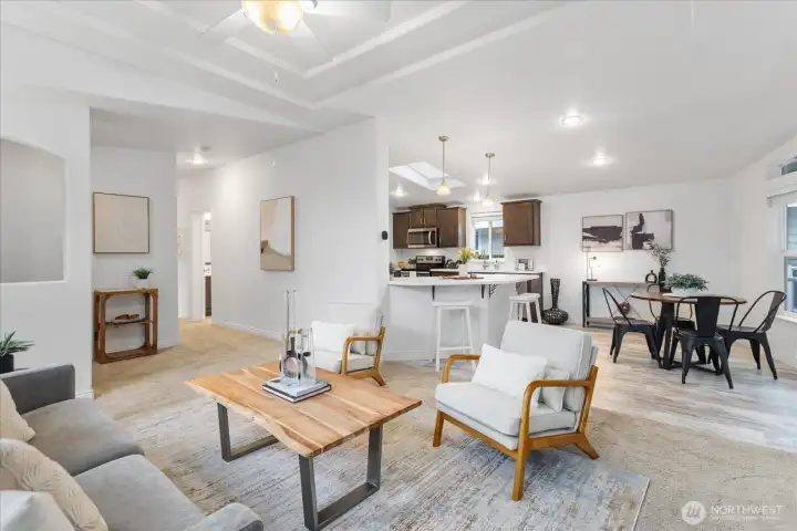Welcome to Green Acres, a sought-after 55+ community. This charming 3-bed, 2-bath home offers comfortable living with vaulted ceilings, an open floor plan, and abundant natural light. The kitchen features ample cabinetry, peninsula with bar with room for a dining table and a walk-in pantry. Enjoy a large deck overlooking the pond to have morning coffee and enjoy the wildlife. Double carport with storage shed as well as nearby guest parking. Community amenities include a clubhouse, walking trails, lakes, dog park, and daily activities. Prime Canyon Park location with easy access to I-405, shopping, dining, and medical.