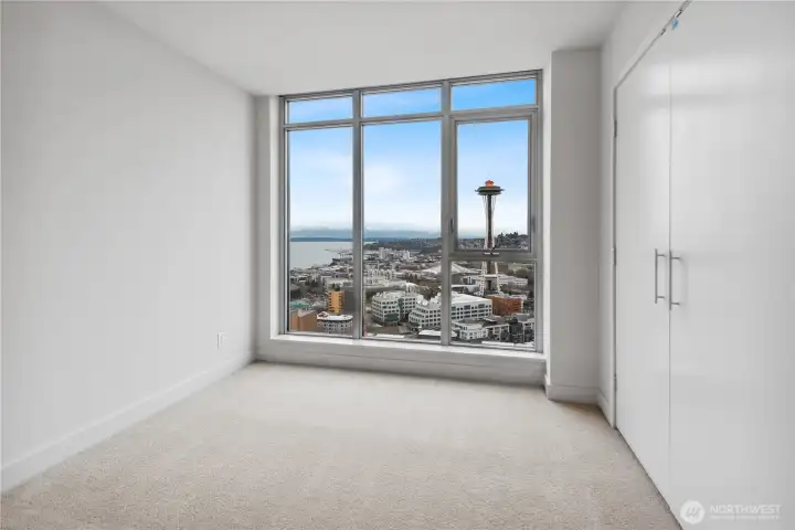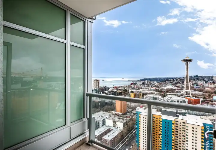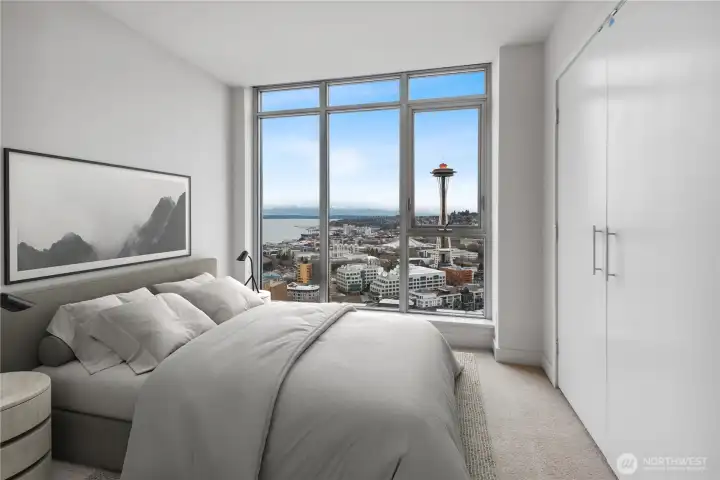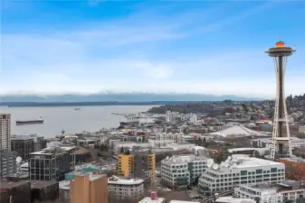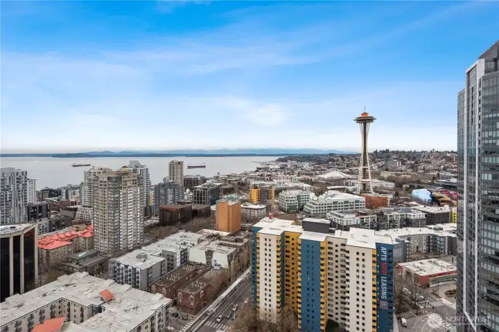 Sweeping, front-row views of the Space Needle, Elliott Bay, & QA are showcased from this 31st-floor 2BD+DEN home! Situated on the NE corner, the open-concept design features a chef-worthy kitchen w/quartz counters & premium Bosch/Thermador appl (gas stv), seamlessly flowing into the expansive dining & living areas wrapped w/wall-to-wall wndws. Formal entry, enclosed/private den, 2 graciously sized BDs, spa-inspired BAs & 2 covered balconies- perfect for iconic sunsets over the Sound year-round. Great strg, side-by-side w/d & A/C too! Insignia 5-star amenities include a 24-hr concierge, theater rm, lap pool/spa, 2-story fitness, 7th-flr park, & two 41st-flr multi-use resident areas w/rooftop decks, game rm, clubrm, bar & dog run. 2prkg/1strg