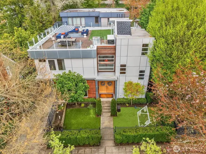 Set in one of Washington Park’s most desirable locations, this sleek modern home feels both brand new and beautifully spacious, filled with natural light and designed for relaxed everyday living and memorable gatherings alike. The interior has been freshly repainted throughout. Privately gated, the residence features a turf courtyard and a rare four-car heated garage. The open, light-filled layout effortlessly connects the living, dining, and kitchen spaces, framed by oversized windows that bring in abundant natural light throughout. The kitchen is both striking and functional, appointed with white quartz countertops, Miele appliances, a wet bar, and a beverage refrigerator, and opens to a covered balcony with a built-in barbecue for seamless indoor-outdoor living. A chic office or fourth bedroom completes the main level. Upstairs, the luxurious primary suite is joined by two additional bedrooms with a Jack-and-Jill bath, along with a generous laundry room. An expansive rooftop deck with partial turf and a built-in barbecue creates an inviting space for entertaining or relaxing. Additional features include a golf simulator, media room, and a 250-bottle wine cellar. Ideally located with easy access to Bush School, as well as nearby shops and cafés.