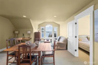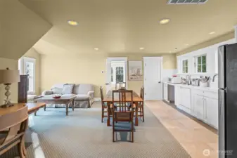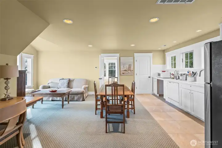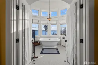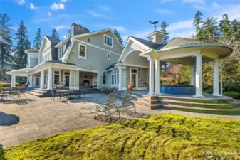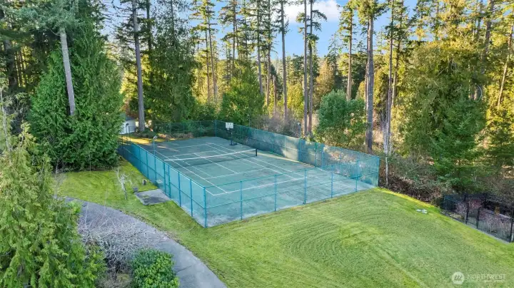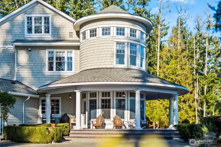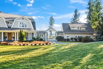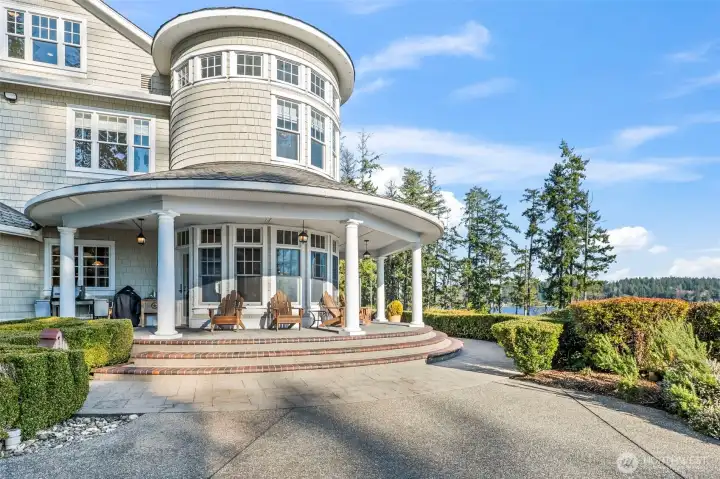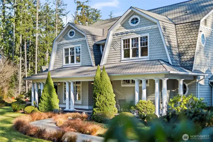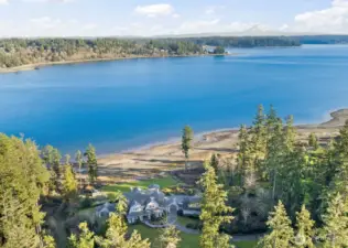 Timeless East Coast–inspired Shingle Style estate on a gated 5-acre sanctuary with 350’ of rare no-bank waterfront—a retreat created for those who prize privacy, beauty, and the ability to truly unplug. Tucked away from the world yet minutes from marinas, dining, and everyday conveniences, the property offers the ideal balance of complete seclusion with effortless access. The primary residence welcomes with soaring 20’ ceilings, an open yet intimate floor plan, walls of windows, wraparound porches, and sweeping views of Puget Sound and Mount Rainier. A chef’s kitchen with marble counters flows to the great room with stone fireplace, while a private spa wing with exercise area and hot tub becomes a personal wellness escape. The grounds invite a refined estate lifestyle: quiet mornings on the porch, meditative walks along your own beach, kayaking & paddle boarding, or casting for fish. Host friendly matches on the private tennis court, set out croquet or badminton on broad lawns, and gather at dusk around the outdoor fireplace. The beach is rich with oysters and clams, perfect for simple seaside suppers beneath brilliant stars. Main house offers 3 ensuite bedrooms; detached 3-car garage includes a guest apartment with 1 bed, 1 bath, and sleeping alcoves for guests or staff. Gardens, fruit trees, gazebo, and woodland trails create a setting where life slows and weekends feel like holidays. A rare legacy property for multigenerational gatherings and restorative escapes.