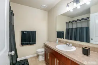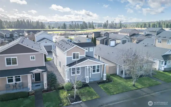 Welcome to this modern home located in the sought after Tahoma Terra community, offering 3 bedrooms and 2.5 baths. The main floor primary suite features a spacious ensuite bath and walk-in closet. Upstairs are two additional bedrooms, a full bath, and a generous hallway walk in closet. The open kitchen offers ample cabinetry, tile countertops, a slate backsplash, and all appliances stay. Enjoy the inviting covered front porch and an oversized single car garage with extra storage. A beautifully maintained community park welcomes you at the entrance of the neighborhood. Conveniently located about 30 minutes from JBLM, with shopping and amenities nearby.