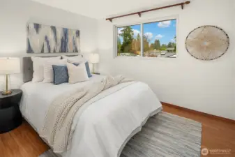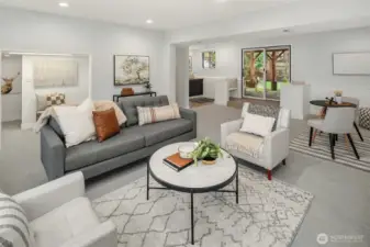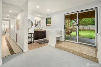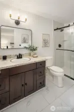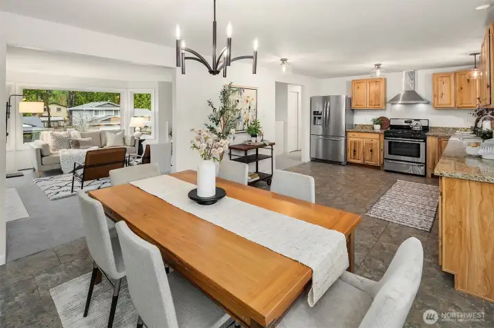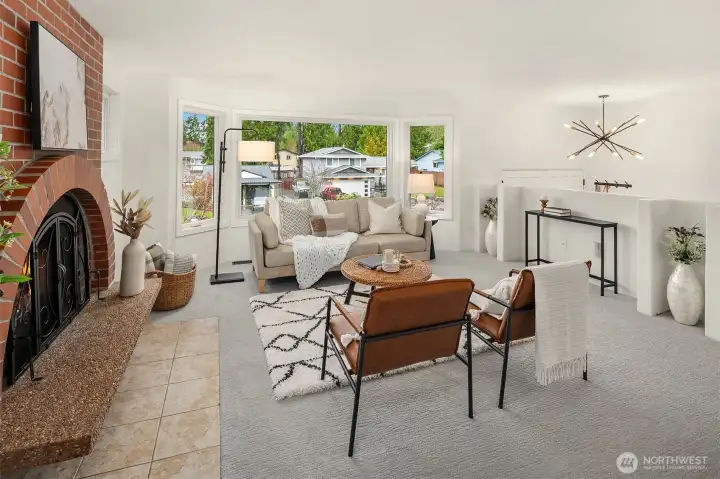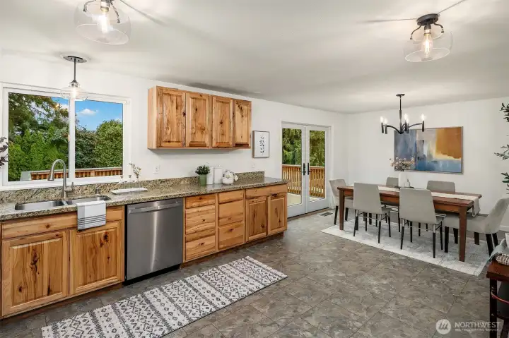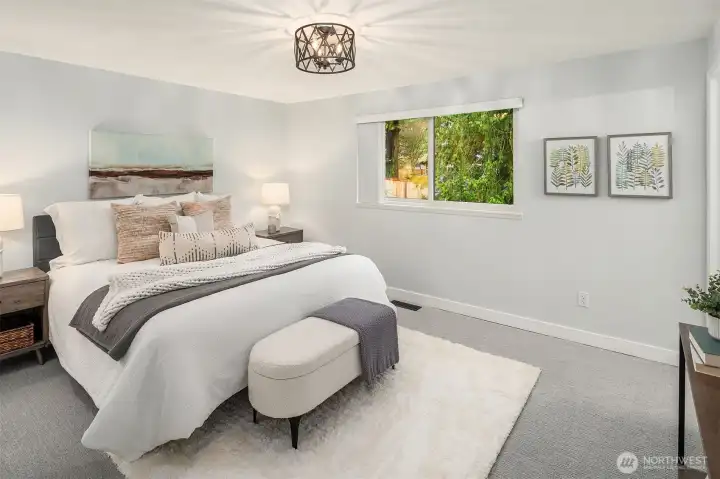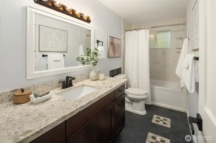 Just a skip from downtown Bothell, this sunny split-level lives large and feels sublime. The arched flagstone fireplace balances warmth against cool, sleek fixtures on the main floor. The kitchen is huge and open to the dining and living areas, providing the ideal space to entertain and connect with loved ones. Bask in the sunshine on the deck overlooking the flat backyard, hot tub, and tall trees. Down the hall, the primary suite has a refreshed bathroom and walk-in closet. The lower level expands the home's footprint with high ceilings, a giant rec room, and a wet bar. A bonus room serves as a WFH office or guest room, with a bathroom nextdoor. With a freshly painted exterior, a new roof, and AC, this is the home you've been waiting for.