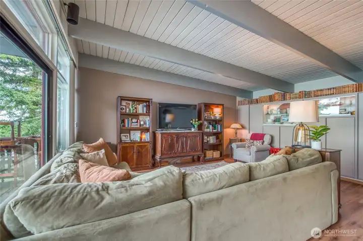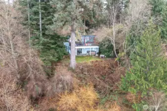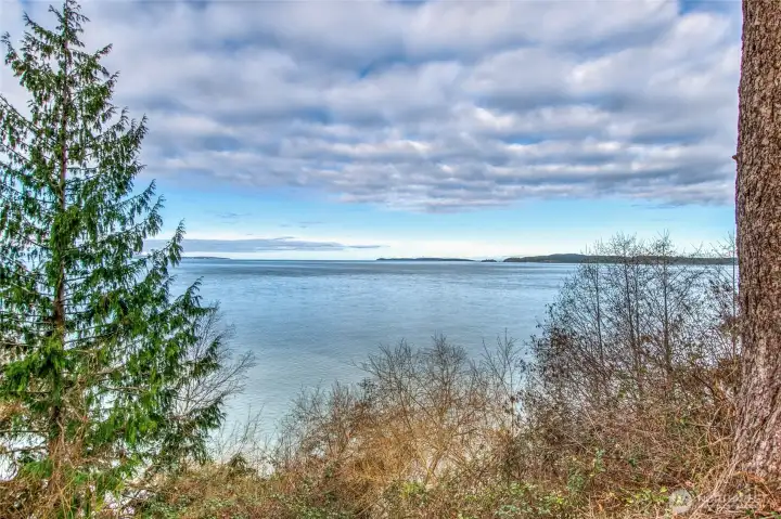 Waterfront property on Orcas Island with beach access along a tucked-away shoreline, located five minutes from Eastsound. The home captures sweeping Salish Sea views toward Sucia Island from nearly every room. The kitchen features stainless steel appliances, and the living room is centered around a cozy fireplace. Outdoor spaces include a hidden gazebo, ground-level patio, hot tub, and a spacious upper-level deck, all offering water views. The property incorporates nautical design elements with a light, whimsical feel throughout, enhancing its coastal character.