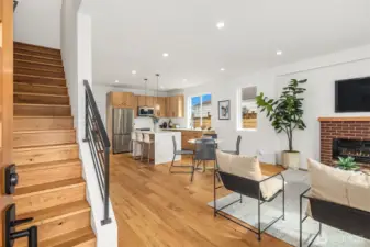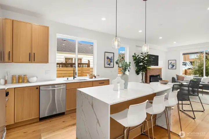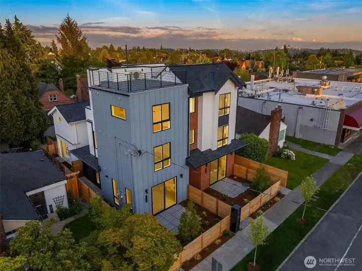 This thoughtfully designed Greenway Homes residence offers a refined balance of modern architecture and everyday livability. Clean lines, abundant natural light, and an open layout create an inviting atmosphere. The main level is anchored by a spacious kitchen with an oversized island, bar seating and expansive windows. A fireplace and powder room add comfort and convenience. The upper level provides two generous bedrooms and a top-level primary suite featuring a spa-inspired bath, walk-in closet + an additional bedroom suited for guests or a home office. A rooftop deck extends the living space outdoors - ideal for entertaining. A/C, fenced yard, and dedicated parking w/ EV charging, all located near neighborhood shops, cafés, and parks.