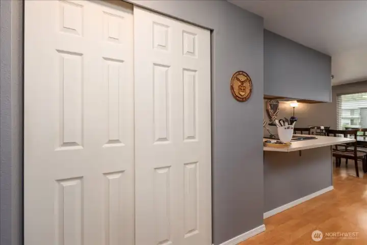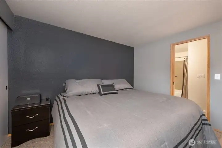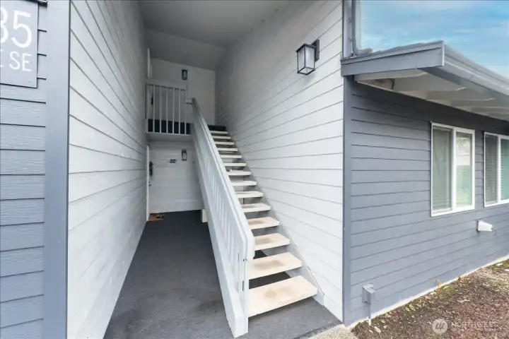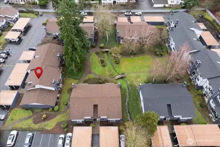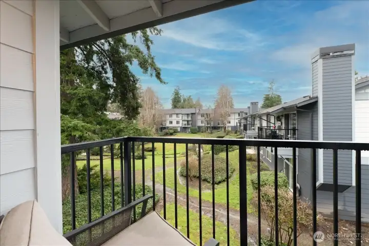 Perched on the top floor of Twin Firs in Kent, this move-in-ready two bedroom condo is a rare find. Updated interiors pair with a cozy wood stove and in-unit laundry for everyday comfort. Large living space flows into dining room and open galley kitchen. Spacious bedrooms with a semi-en-suite off the primary, plus plenty of closet storage throughout. Step onto your private balcony overlooking the serene inner courtyard—lush trees, a meandering creek, and charming bridges create a peaceful, park-like setting. Centrally located yet tucked away, this secure, gated community offers dedicated covered parking, tons of guest parking, and a huge storage unit. Well managed HOA with no special assessments. A truly special home that blends convenience with tranquility.