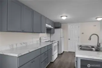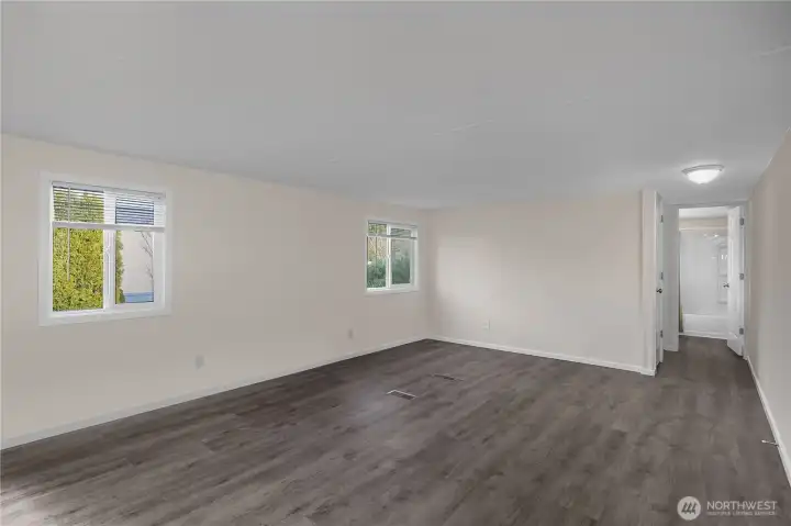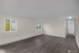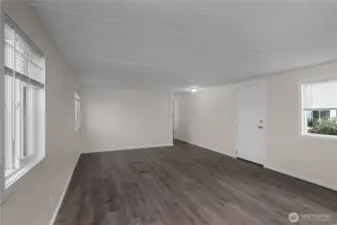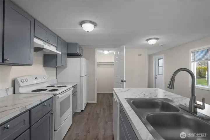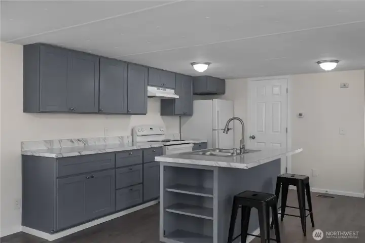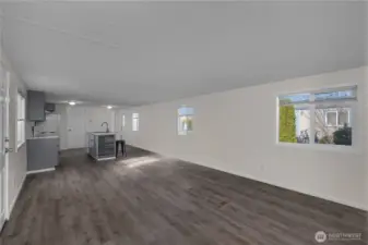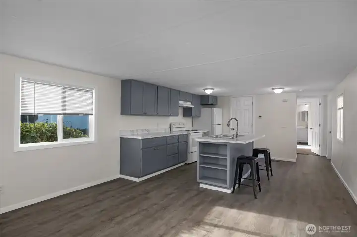 All-ages park, Tumwater schools. Fully remodeled, 2 bedroom, 2 bathroom, 980 sf +/- home in beautifully maintained Los Cedros! The front door opens to a spacious open concept kitchen and living area with the primary bedroom suite to the left and 2nd bedroom and full bath to the right. The kitchen cabinetry, counters, fixtures and appliances just installed in 2024. Laundry room/pantry off kitchen. Windows, blinds, doors, walls, trim and lighting as well as new luxury vinyl plank and new carpet in the bedrooms in 2024. Roof also done in 2024, large storage shed and two parking spaces. $705/mo lot - covers water & sewer. Close to I5 and Tumwater amenities. Tenant screening process with park mgr.