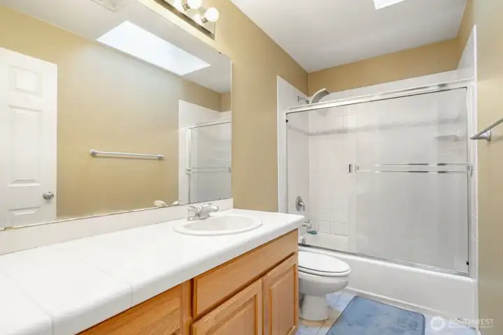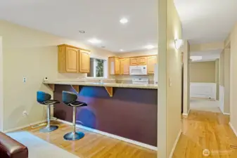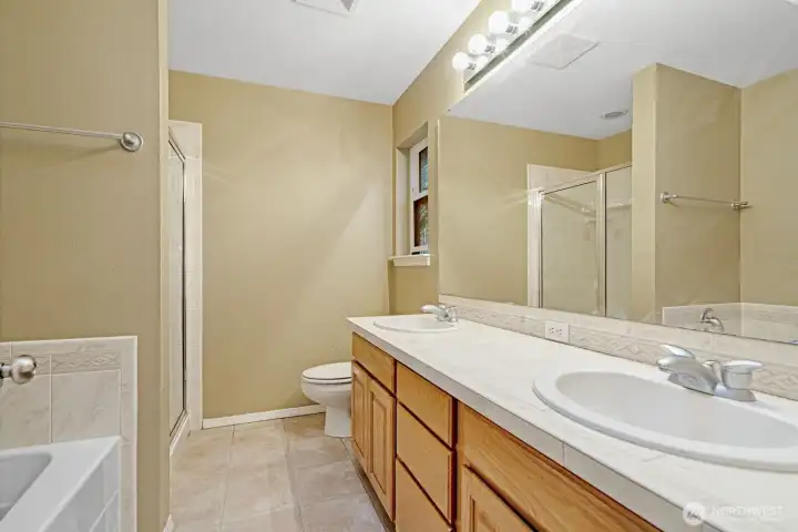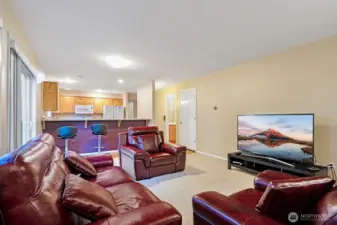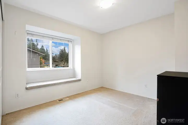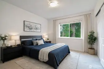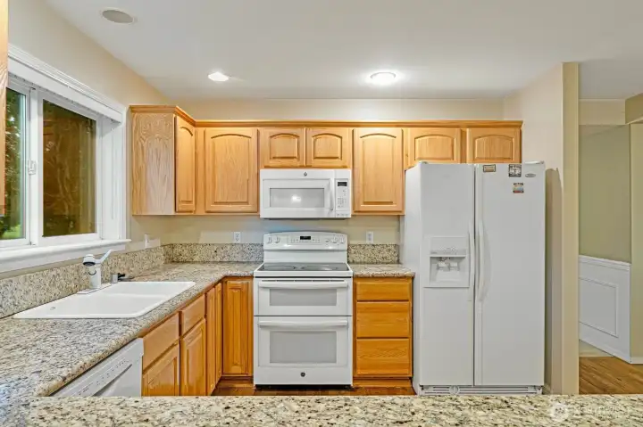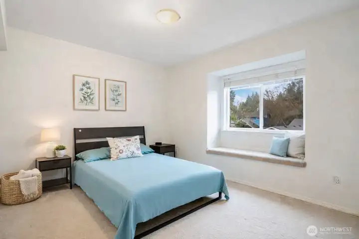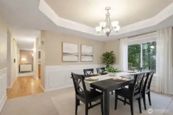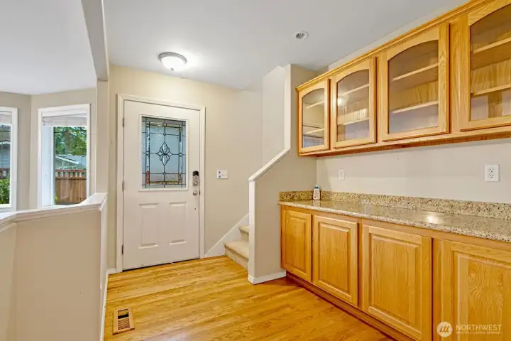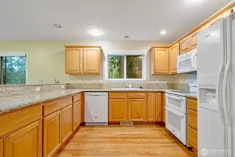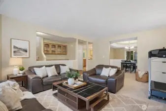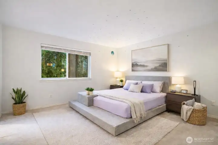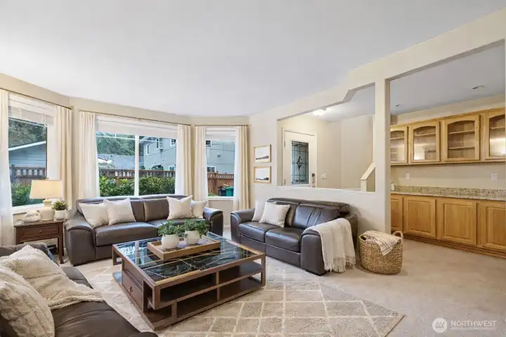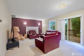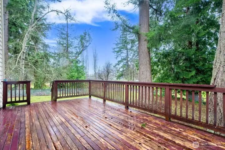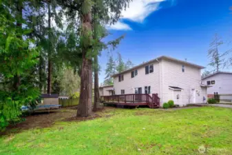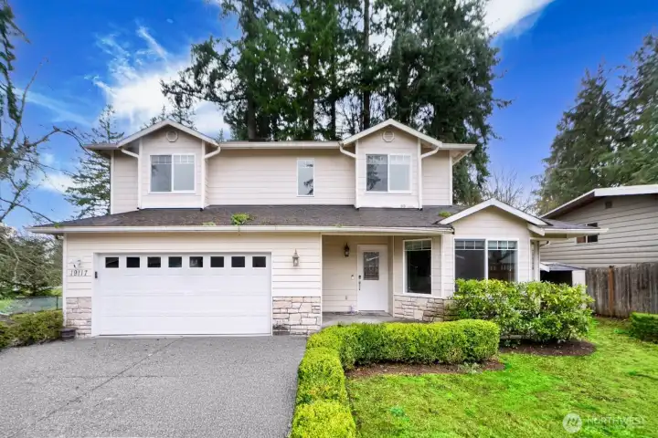 Spacious two-story home featuring 4 bedrooms and 2.5 baths. Sunny home, slab granite counters, hardwoods, family rm connects to huge deck over grassy oasis. Back yard blends into a greenbelt-like setting providing privacy galore. 2 car garage, wainscotting, coffered ceilings in dining, divine master suite, forced air gas, quite private rd, parking for 8+cars, excellent Shoreline school. Walk to groceries, restaurants, schools, parks, buses.