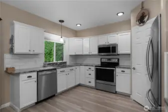 Well maintained 3-bedroom, 2.5-bath home offering 1,764 sq ft of comfortable and functional living space. High ceilings create an open, airy feel throughout the main level, which includes a formal living room and an updated kitchen with an adjoining dining area—ideal for both everyday living and entertaining. The lower level features an updated half bath, laundry room, and a perfectly sized family room with a gas fireplace. Outside the family room is the amazing cedar-covered patio w/ ceiling fan—perfect for relaxing or barbecuing in any weather. Enjoy exceptional peace & privacy with a greenbelt behind the home and additional open space to one side. Recent upgrades include newer windows, air conditioning, furnace, water heater, and roof, providing peace of mind for years to come. All bathrooms were also remodeled in 2021. Located in a well-situated neighborhood close to shopping, dining, and everyday amenities, this home offers an ideal balance of comfort, privacy, and convenience. Oly schools!