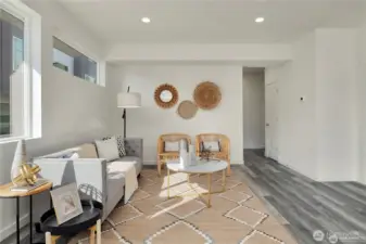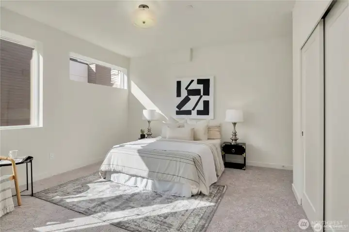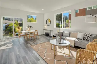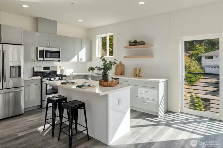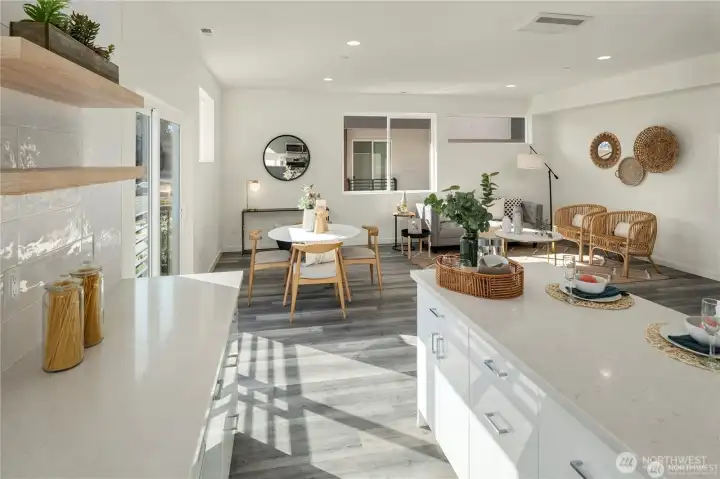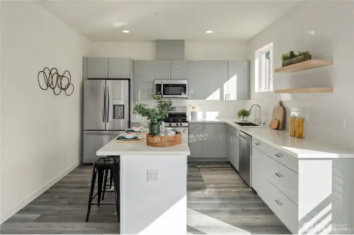 Eco-friendly 4-Star Built Green townhome! Boasts an open layout, 9-foot ceilings, fire sprinklers, ample windows, LVP flooring, smart Ring doorbell, dual-car garage with programmable keypad, on-demand tankless water heater, and a (96%) high-efficiency furnace. Kitchen features quartz countertops, stainless steel appliances, gas stove range, soft-close cabinets, and floating shelves. Upper level includes 3 Bedrooms and 2 Baths, with the Master Suite offering a spacious double shower, dual sinks, and extra closets. The 12x19 ft rooftop deck is ideal for unwinding and entertaining. Proximity to shopping, bus lines, upcoming light rail, Costco, Trader Joe’s, and I-5. Less than 10 minutes to beaches, parks, golf, and schools.