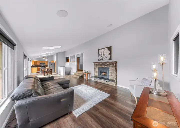 Commanding lake views and soaring architectural lines create an unforgettable first impression the moment you enter. A slate tile entry welcomes you into an open concept main level where vaulted ceilings, a wall of windows, and abundant natural light create an inviting, airy feel. The living room with gas fireplace and built-in speakers, dining, and chef’s kitchen flow seamlessly together, while the oversized view deck sets the stage for memorable gatherings. The main level primary suite offers privacy and convenience with a jetted tub, generous closets, and space for a stackable washer and dryer, making one level living possible. Two additional bedrooms and an updated bath complete the main floor. The lower level adds exceptional flexibility with a large bonus room featuring a fireplace, an additional finished room, large laundry room, and a half bath, ideal for a fourth bedroom, guest quarters, or future second living area with kitchenette potential. Outside, enjoy a fully fenced yard with patio, hot tub, gazebo and firepit. A/C, 2 car garage, extra parking, and storage shed for all your gear complete the package, just minutes to North Cove Park, Lundeen Park boat launch, and the local swimming beach.