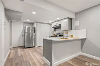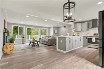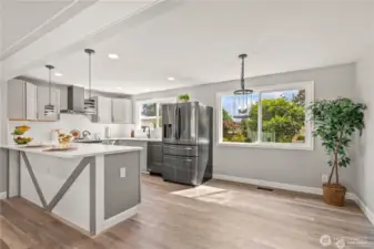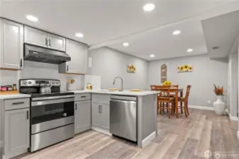 Stunning fully remodeled home featuring 5 bedrooms and 2 bathrooms in a spacious rambler with a finished basement. A wall has been installed downstairs for added privacy, creating a versatile layout with 3 bedrooms and 1 bathroom on the main level, and a 2-bedroom, 1-bath ADU on the lower level. This home offers ample space to accommodate all your needs, including an enormous 770 sq ft garage, two kitchens, and an additional family room downstairs, both with Fireplaces- perfect for entertaining. Both kitchens are equipped with stainless steel appliances, quartz countertops, and abundant cabinetry. Ideal for owner-occupants or investors—live upstairs and rent the lower level, or simply enjoy the generous living space. Step outside to a tremendous deck with partial views and a fully fenced, oversized backyard with green belt on the back for privacy. Conveniently located just 9 minutes from White Center and minutes from downtown Seattle, with easy access to downtown Burien, offering restaurants, shops, breweries, farmers markets, and public transit.