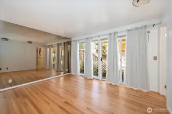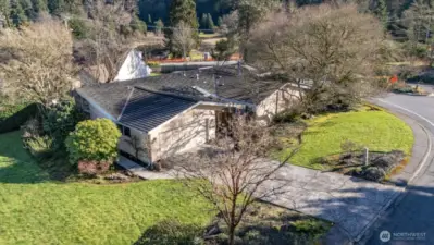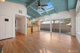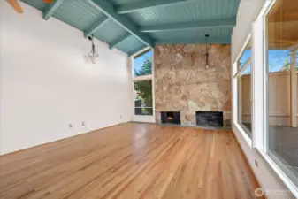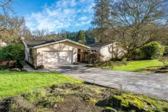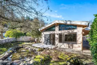 Mid-century modern rambler in the highly sought-after Valhalla community of Bothell. This beautifully maintained 3-bedroom, 2-bath home showcases open-concept living spaces filled with natural light, soaring ceilings, and skylights that create an airy, inviting atmosphere. Newer hardwood floors add warmth and elegance throughout. Enjoy the comfort of two fireplaces—one gas and one wood-burning—perfect for cozy evenings. The kitchen offers distinctive character and seamless access to the backyard through sliding glass doors, making indoor-outdoor living effortless. An expansive sunroom opens to a private, sun-drenched patio featuring a tranquil water feature and pond surrounded by seasonal ground cover and flowers. Situated proudly on a well manicured corner lot, this home also includes access to the community pool, located right around the corner. A rare opportunity in a prime location—this home is truly a must-see.