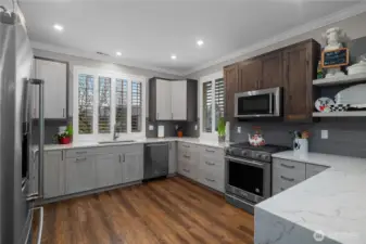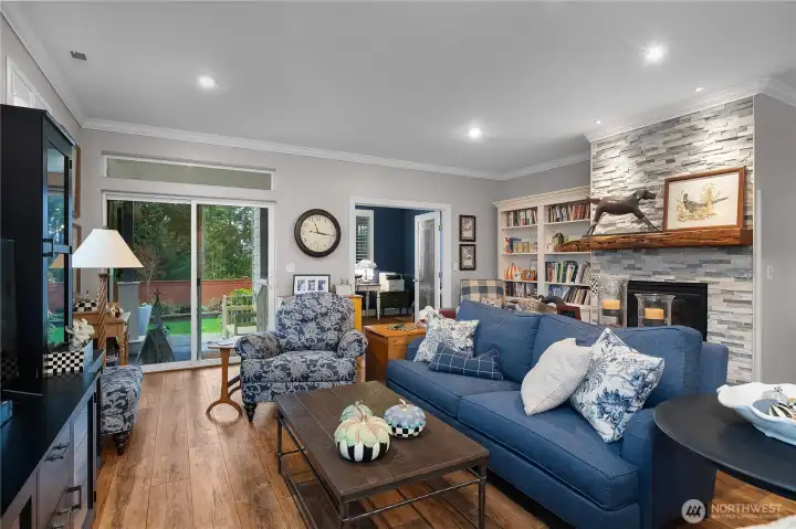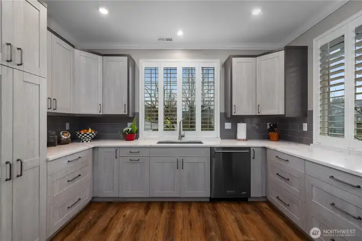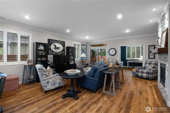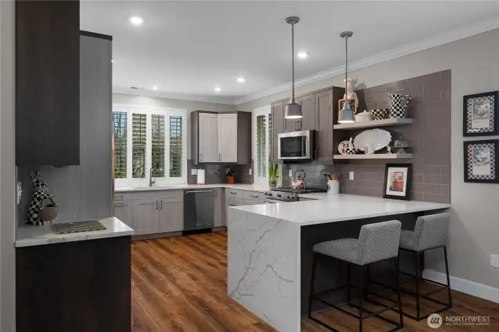 This CUSTOM Woodlands floorplan offers over $200,000 in upgrades with elevated design & functionality throughout. New Roof (2025), LVP flooring, crown molding, wood shutters, & California Closet system enhance the home. The remodeled kitchen features hickory-wrapped cabinetry, quartz waterfall countertops, subway tile backsplash, under-cabinet lighting, upgraded appliances, & a wine cooler. The living area showcases a fireplace with floor-to-ceiling stone & a reclaimed wood mantle. The primary bath includes a curbless tiled shower, frameless glass, floating vanity w/quartz countertops, & a transom window. Enjoy a redesigned backyard with expanded paver patio, custom patio cover with decorative lighting, & raised irrigated garden beds.