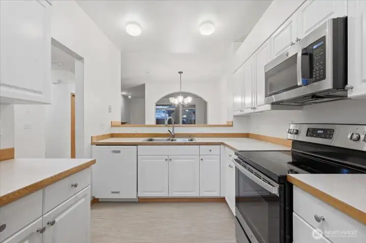Hard-to-find 3-bedroom, 2-bath ground-level end unit with no rental cap and a private fenced backyard—perfect for homeowners and investors alike. This 1,346 sq ft home offers true no-step living and a desirable open floor plan. The kitchen features a convenient countertop bar and flows seamlessly into the dining and living areas, making it ideal for everyday living and entertaining. The living room is anchored by a cozy gas fireplace and opens to a private patio and fenced yard—great for pets, gardening, or relaxing outdoors. The spacious primary suite includes a large walk-in closet and an en-suite bath with dual vanities. Two additional bedrooms provide flexibility for guests, a home office, or hobby space. Enjoy the convenience of an in-unit washer and dryer, a 1-car garage with shelving, plus an additional dedicated parking space. Ideally located near shopping, restaurants, parks, waterfront access, and the Burke-Gilman Trail. Photos are virtually staged to showcase the home’s potential—don’t miss this rare opportunity!