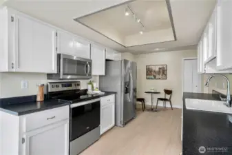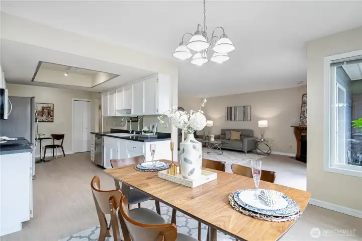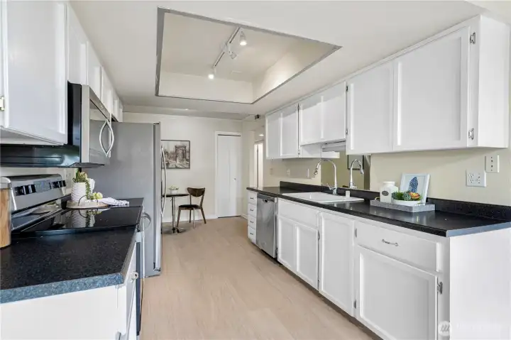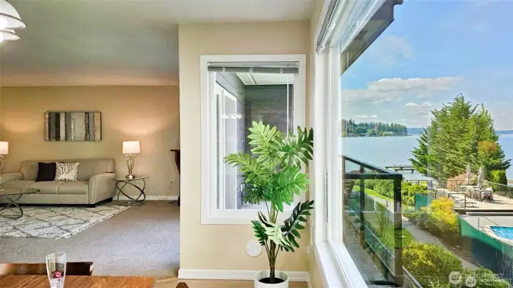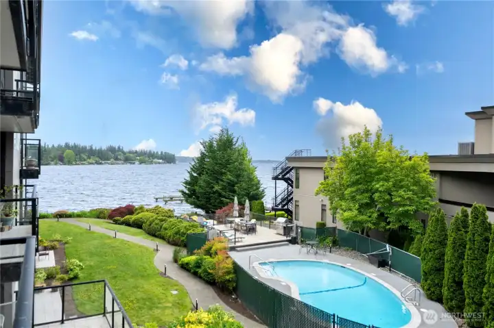 Live your waterfront dream in this spacious, light-filled 2 bed/2 bath just steps from Juanita Beach Park. Soak in sweeping lake views and private lake access -perfect for paddleboarding, kayaking, or s'mores by the fire pit. This generously sized condo features updated s/s appliances, paint, floors, modern lighting. Large bedrooms with spacious closets (walk-in closet with the primary) and ample storage throughout. Building was beautifully remodeled in 2019, with a new gym and updated pool completed in 2024. Amenities: private beach, fire pit, sauna, clubhouse, pool, day moorage, elevator, gated entry, 2 covered parking spots, storage, guest parking. No rental cap! One block to Juanita Village’s shops, restaurants, cafes, and more.