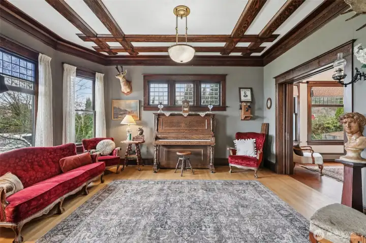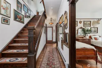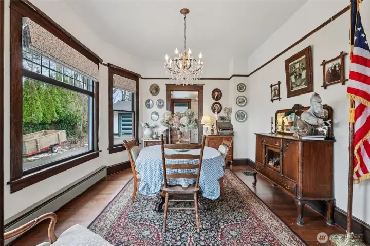 Perched gracefully on the hill, this 1918 historic manor tells a story of craftsmanship, care, and timeless elegance. From the moment you arrive, the wraparound porch invites slow mornings with coffee and sweeping territorial views. Inside, original fir floors, rich wood trim, and built-in cabinetry reflect over a century of thoughtful design. Sunlight filters through 100-year-old beveled windows, illuminating rare Steuben Glass light fixtures and preserved period details throughout. With four bedrooms and two baths, the home blends livability with legacy. Immaculately maintained and celebrated as a 2019 Stanwood newspaper cover feature, this is a rare opportunity to own a piece of history—beautifully lived in and lovingly preserved.