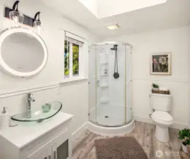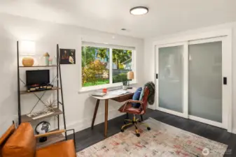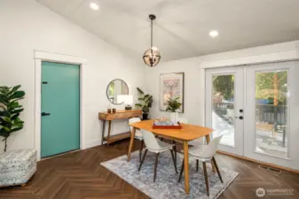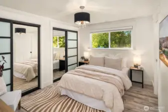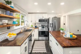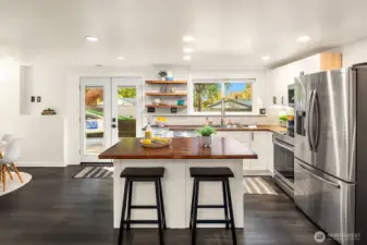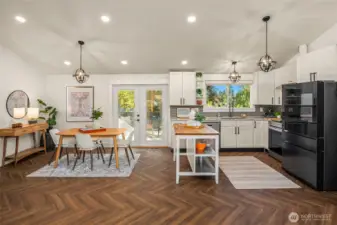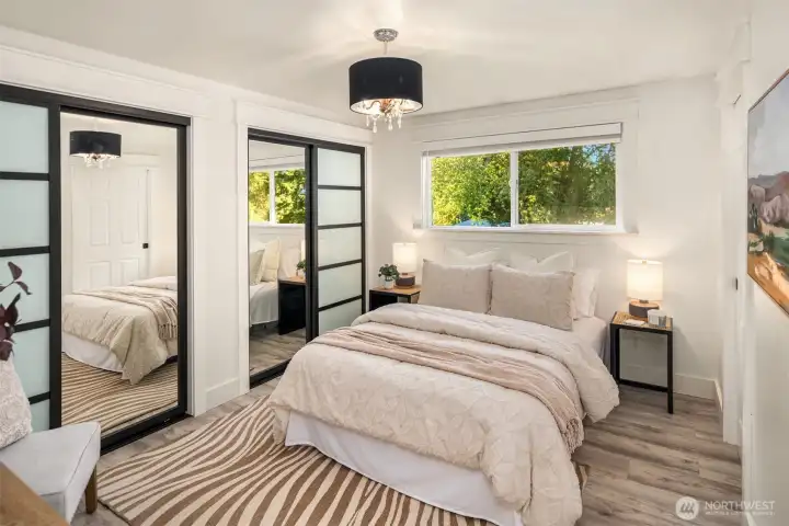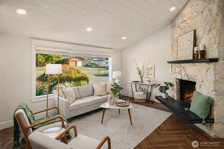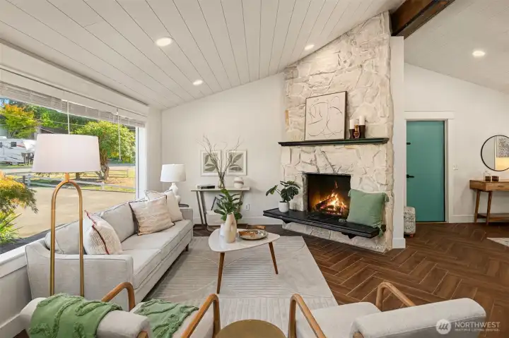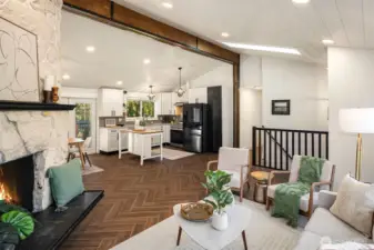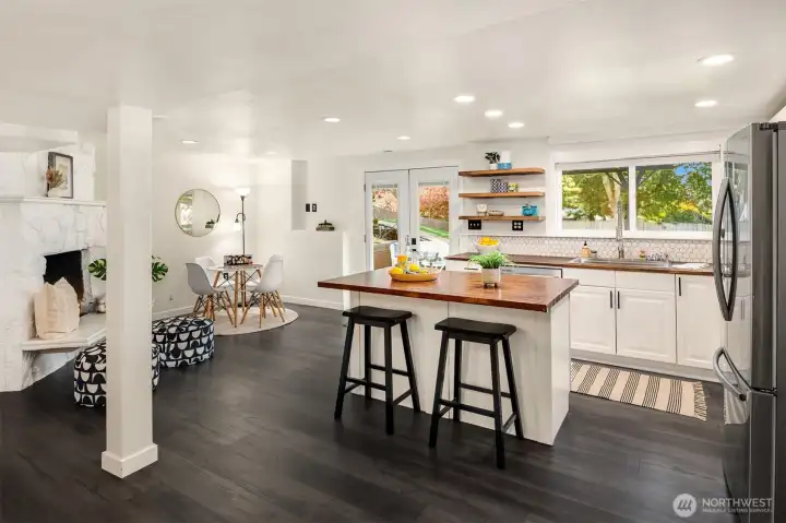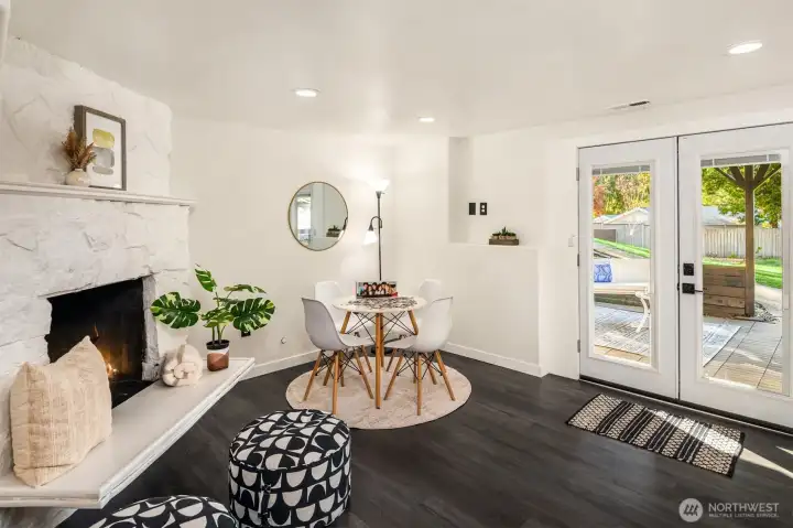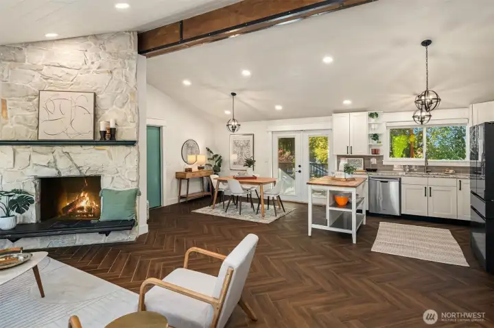 Welcome to this beautifully updated mid-century home with classic Craftsman charm, tucked away on a quiet, inviting street. Vaulted ceilings, hardwood floors, and abundant natural light set the tone as you step into the open main-level layout. The living and dining spaces flow effortlessly around an impressive fireplace, creating a warm and welcoming heart of the home. The main level also features a lovely kitchen, three well-proportioned bedrooms, and two full baths, including a sunny primary suite with en suite. Step outside to the spacious deck, perfect for morning coffee, evening dinners, or weekend entertaining surrounded by trees. Downstairs, a second full living space dramatically expands how this home can be enjoyed. With its own private entrance, this level includes two large bedrooms, an updated second kitchen, additional laundry, a full bath, and a generous living area that opens to a private patio. The thoughtful separation creates an ideal independent living arrangement, offering exceptional flexibility for extended stays, multi-generational living, work-from-home needs, or future lifestyle options that benefit from privacy and autonomy. Outside, the fully fenced yard offers space to garden, play, and gather, creating a true extension of the living areas. With two distinct living spaces, thoughtful updates throughout, and room to adapt over time, this home offers rare versatility and long-term appeal.