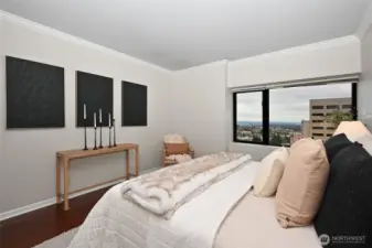 Spacious 2 br, 16th floor SE corner home offers spectacular views of the city, mountains and Lake Washington from the floor to ceiling windows. Primary ensuite features an exquisite soaking tub & extensive closets, while the 2nd bedroom doubles as office space with built in cabinets. Kitchen has been updated with generous granite countertops, ss appliances & open cupboards. Unit offers A/C as well as W/D, 1 parking spot & a large storage unit. First Hill Plaza is a premier full-service building offering resort style amenities including 24-hour concierge, indoor rooftop pool,renovated courtyard, tennis/pickleball court, guest suite & secure parking. Located between Downtown & Capitol Hill, moments from dining, culture & daily essentials.