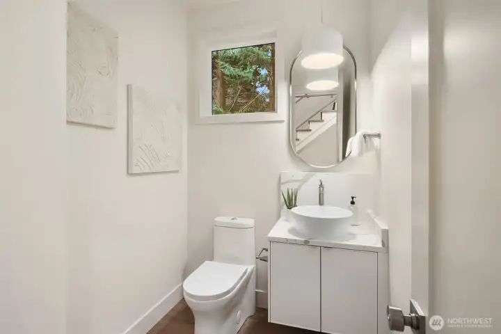 New construction with a coastal flair in coveted West of Market. Light-filled main level features open living, dining, and kitchen with gas fireplace, built-ins, and sliders to a covered patio and fenced yard—perfect for indoor/outdoor living. Kitchen shines with Monogram appliances and custom cabinetry, with drybar in the dining room. Upstairs offers a serene primary suite, two additional bedrooms, full bath, and oversize laundry with extensive storage. Fully finished basement includes a spacious rec room for entertaining, dry bar with beverage fridge, plus guest bed and bath. Enjoy proximity to Lake Washington, Waverly Beach Park, and downtown Kirkland. EV-ready garage completes this home!