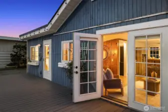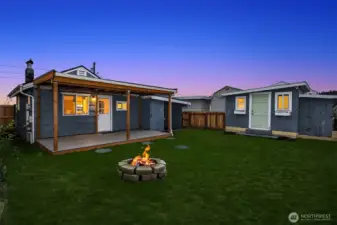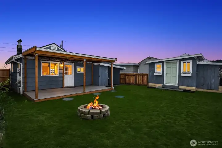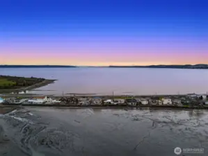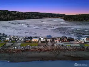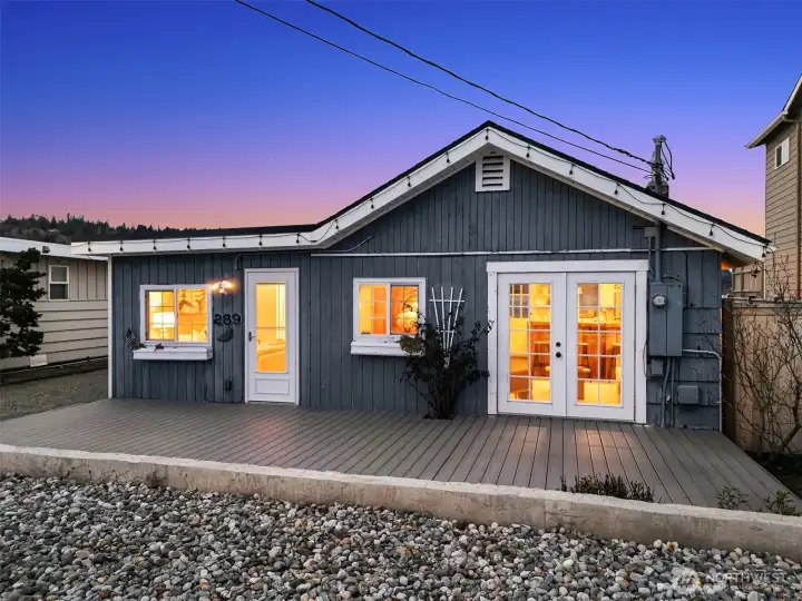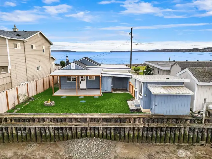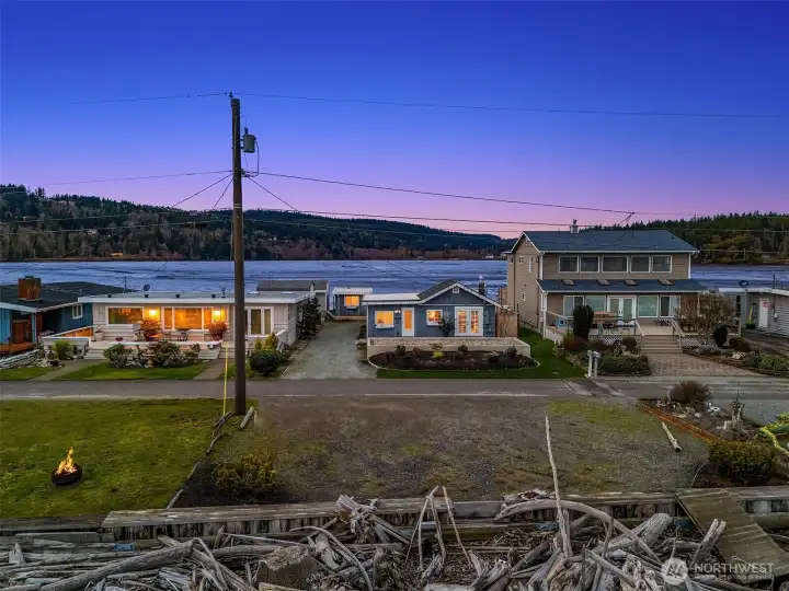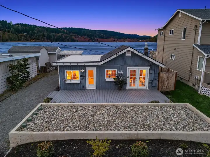 Escape to your own waterfront paradise, this charming cabin boasts rare level access to the shore. Captivating panoramic views of Port Susan, Barnum Point, and majestic Mt. Rainier await! Inside, enjoy cozy evenings by the wood-stove, a spacious walk-in closet, and French doors opening to a durable composite deck. A separate guest bungalow adds versatility for visitors or extra space. Stroll the private beach for treasure hunting and leisurely walks. This delightful cabin feels spacious and inviting—ideal as a peaceful weekend getaway, lucrative vacation rental, or year-round home in the desirable Driftwood Shores. Plus, over $20,000 of recent upgrades including the back deck, pergola, fencing, and a new septic system for peace of mind.
