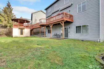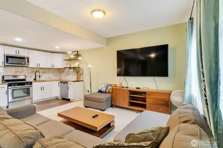 Spacious home on a large lot with mountain and sunset views, offering 5 bedrooms and 3.5 baths with flexible living space. The main level features formal living and dining rooms with soaring ceilings and abundant natural light. The kitchen includes a large granite island, granite countertops, stainless steel appliances, and a gas cooktop. Two fireplaces with marble surrounds add architectural interest, and a curved staircase enhances the home’s elegant design. The remodeled lower level includes a full kitchen, bedroom, full bath, and a generous living area. Major system updates, including the roof and gas hot water tank, were completed in 2020. Additional improvements include central A/C and decorative accent walls.