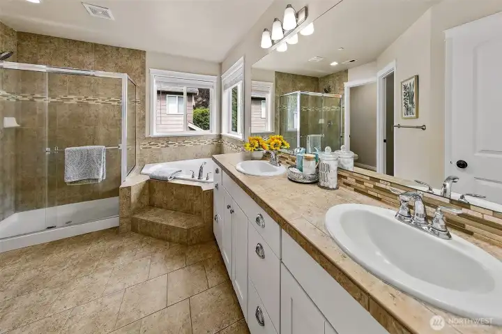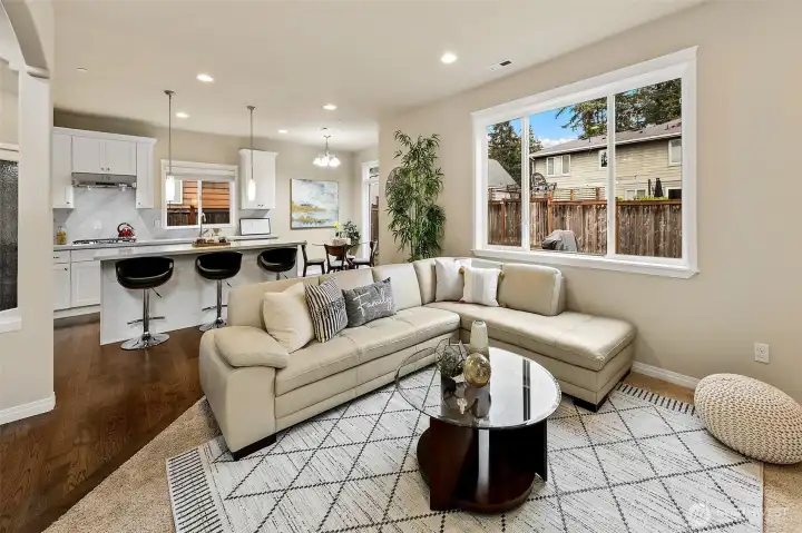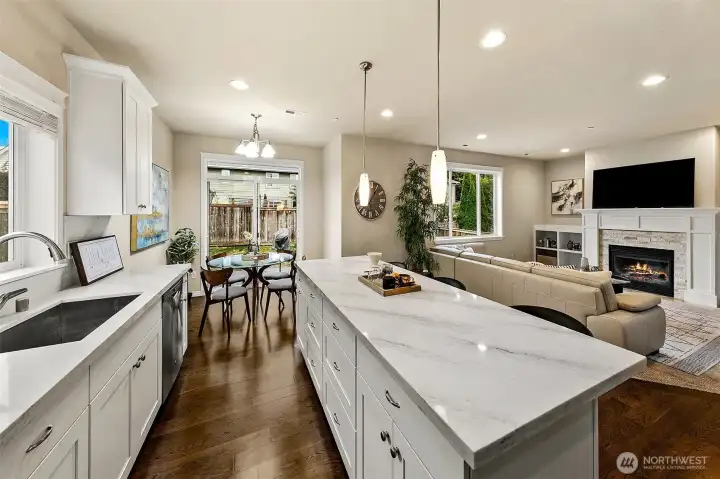 Modern & Bright 4BD + Den/Bonus in Sammamish! Light-filled home with elegant wainscoting in the entry, living, and formal dining. Cozy gas fireplace warms the family room. Updated kitchen features custom cabinetry, quartz counters, large island, and walk-in pantry. Sunlit breakfast nook opens to a flat, fully fenced backyard with paver patio—perfect for entertaining. Upstairs offers 4 spacious bedrooms plus bonus. Luxurious primary suite with 5-piece bath and walk-in closet. Parks & trails nearby. Excellent schools!