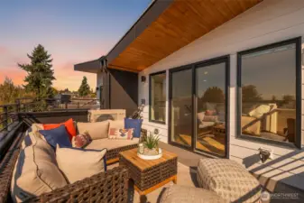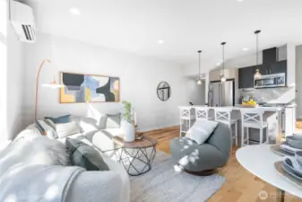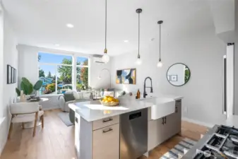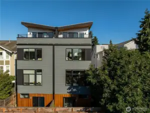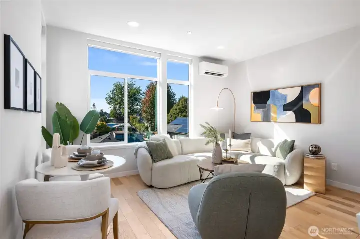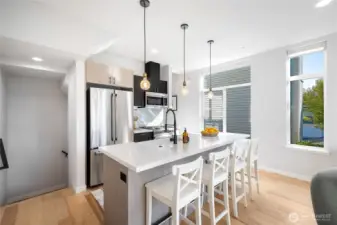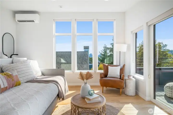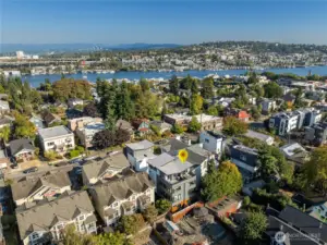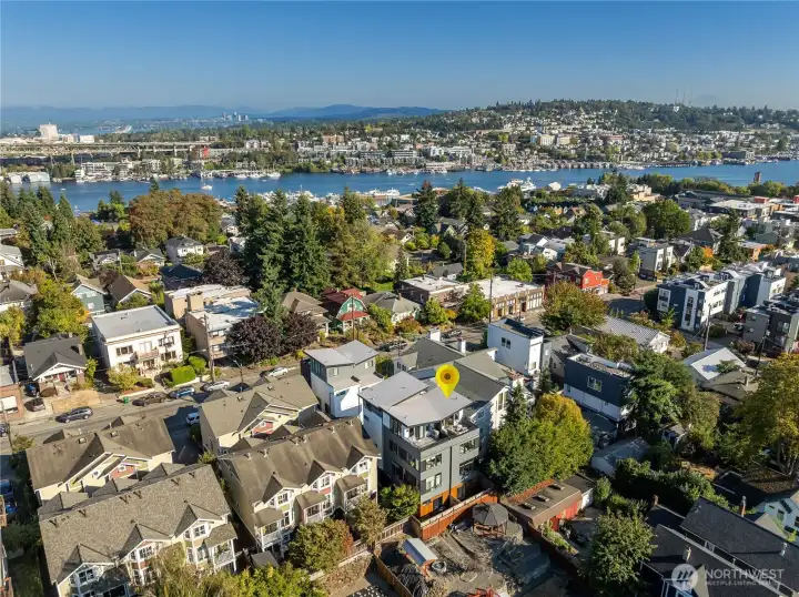 Incredible modern 4-Star Built Green townhome in the heart of Wallingford with sweeping views of Lake Union, downtown Seattle, the Space Needle, and the Olympic Mountains. Watch 4th of July fireworks from the upstairs bedroom/flex room and deck, and enjoy the year-round natural light from the south and west windows. The open concept kitchen, adorned with quartz countertops and hickory hardwoods flows into the living and dining room that privately overlooks the trees. The sunny primary bedroom is ideally sized, includes a walk-in closet and bathroom, and also has views looking west. Live just steps from delicious bakeries, coffee shops, groceries, restaurants, and Gas Works Park—with easy access to Hwy 99 and I-5 without the noise!