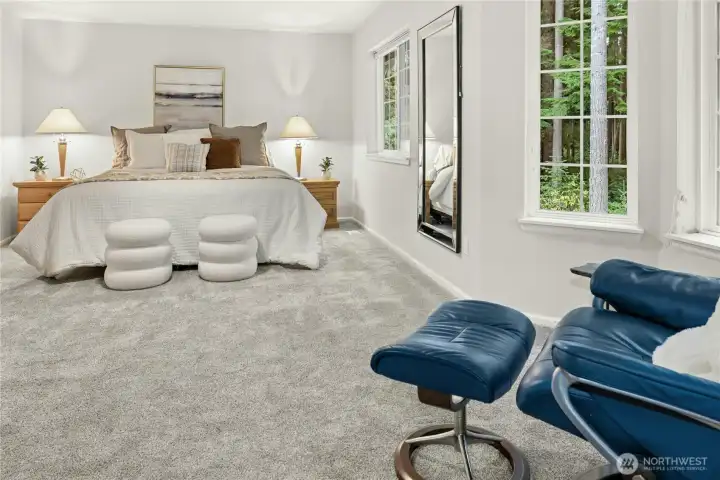 Primary suite overlooks the beautiful backyard. Crack the window before bed and you'll enjoy hearing the bubbling waterfall pond as you drift off to sleep