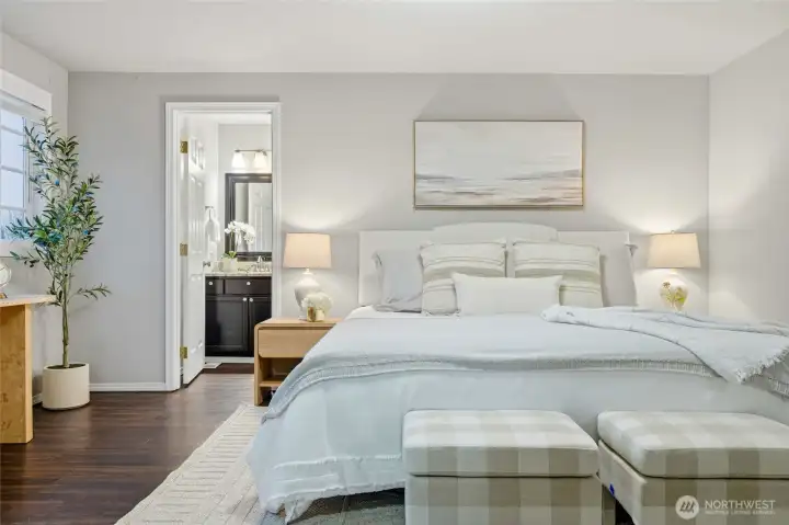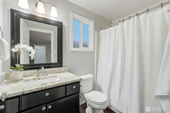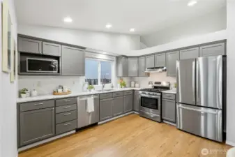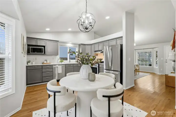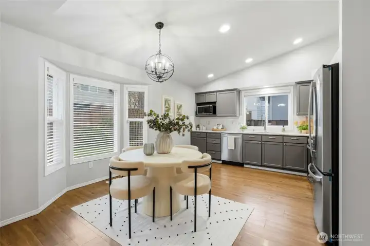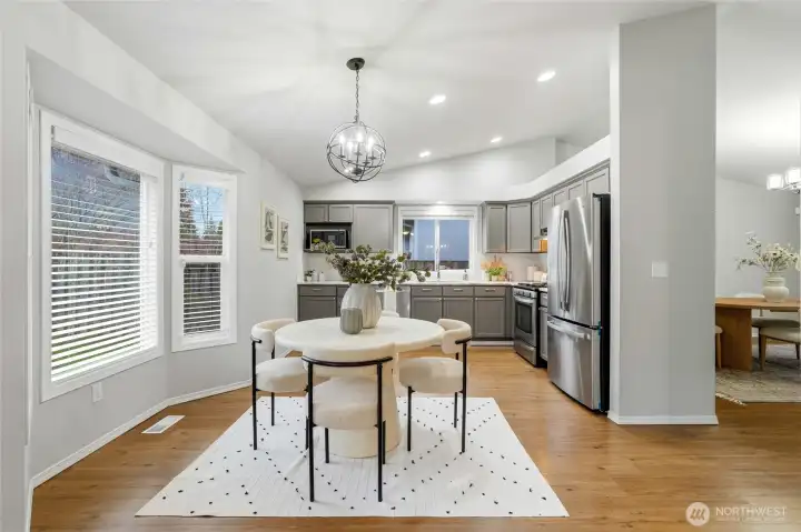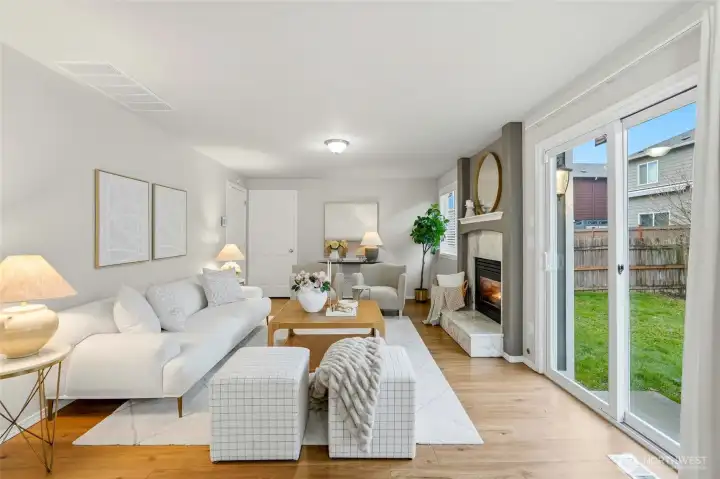 Located on a quiet street in the Whispering Winds community, this well-maintained Lynnwood home offers a balanced layout with timeless appeal. High ceilings and bay windows enhance the living and dining areas, while a gas fireplace provides a natural focal point. The kitchen features stainless steel appliances and quartz countertops and connects seamlessly to the yard and patio for easy indoor-outdoor living. Three bedrooms upstairs include a primary suite with an attached bath. The home has been consistently cared for and includes a new roof, new carpet, new appliances, and air conditioning for added comfort. Conveniently situated near schools, parks, shopping, transit, Hwy 99, and I-5, with a two-car garage and turnkey condition.