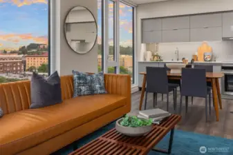 Welcome to KODA—a bold, modern high-rise in Seattle’s vibrant International District. Thoughtfully designed homes feature generously lofted floor-to-ceiling windows, smart layouts, and sleek finishes. This two bedroom, two bathroom + den home features wrap-around windows to maximize natural light to the flexible open-concept layout. Price includes one reserved parking spot, one storage unit. Enjoy unmatched amenities: a wellness center, rooftop terrace with sweeping views, coworking lounge, guest suites, and Club KODA with a theater, kitchen, and dining space. Steps from light rail, Uwajimaya, stadiums, and downtown, KODA blends urban energy with authentic cultural roots. Live where heritage meets modern living.