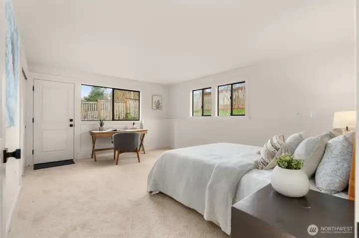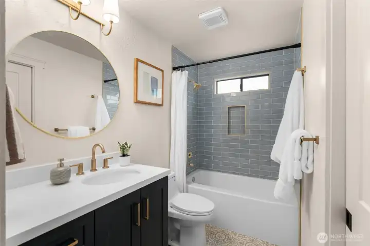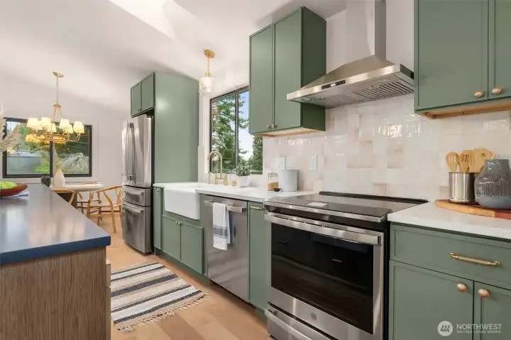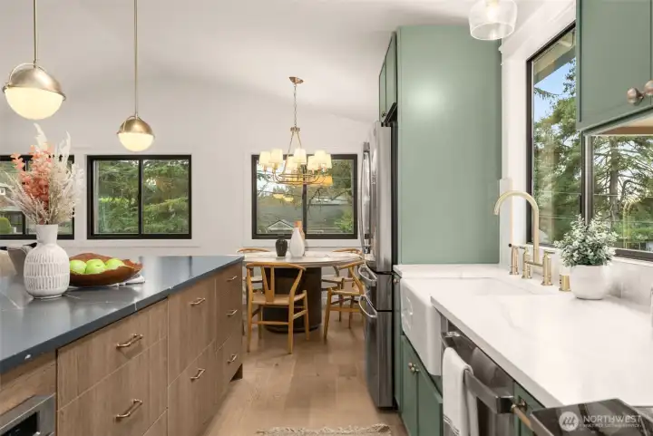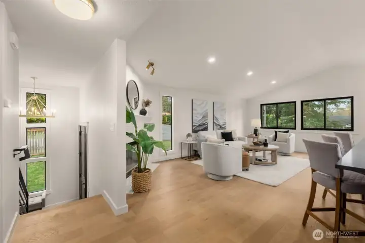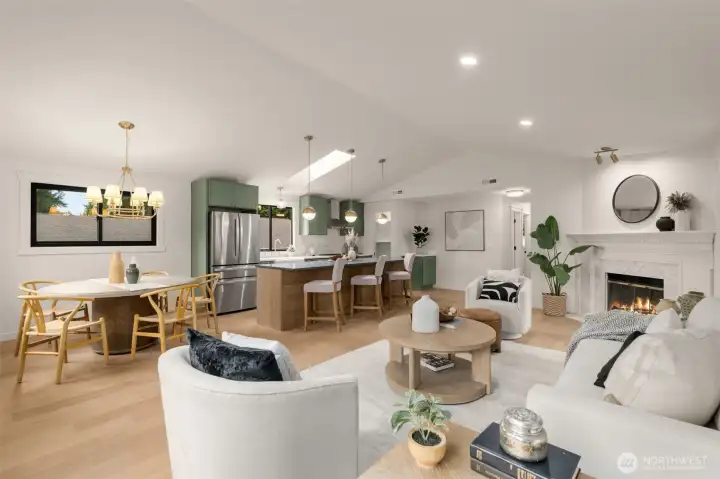 Tastefully remodeled in the heart of Matthews Beach, this turnkey 4-bed, 2-bathroom home lives bright, open, and effortlessly inviting. The upper level showcases a stunning open-concept kitchen, dining, and living room designed for both everyday living and entertaining. A generous eat-in island anchors the space, while vaulted ceilings and expansive picture windows flood the home with natural light throughout the day. Guests can gather in the kitchen and relax around the fireplace as meals and conversation unfold. All-new appliances, a walk-in pantry, and stylish finishes complement the airy layout, creating a true hub of the home. New engineered hardwood floors, fresh interior and exterior updates, plus beautifully remodeled bathrooms elevate the home throughout. Step through the gate to a fully fenced, grassy backyard ideal for sunny afternoons and evenings unwinding by the fire. Tucked away is a spacious, versatile work shed offering ample room for storage, hobbies, or creative pursuits. Major system upgrades include a new roof, new furnace and heat pump, new plumbing and electrical fixtures, and new garage doors—offering peace of mind for years to come. Ideally located just minutes to Matthews Beach Park, Magnuson Park, and the Burke-Gilman Trail, with easy access to transit, neighborhood cafés, and top-rated schools. A rare opportunity to own a truly move-in-ready home in one of North Seattle’s most desirable neighborhoods.