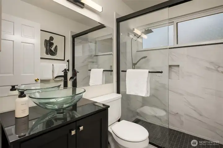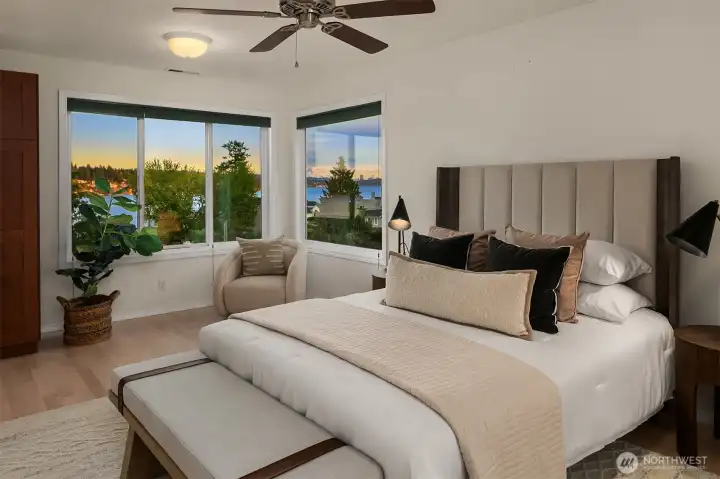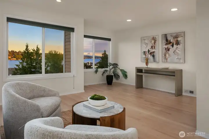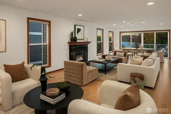 Experience the best of Kirkland living from this recently remodeled 3,740sf home on a private lane in the sought-after Juanita community. Enjoy astounding panoramic Lake WA & Mt Rainier views from all three levels, including shared dock access with convenient boat lift enjoyed at a moments notice. Guests are welcomed into the main level featuring a large kitchen w custom Cherry cabinets and stainless steel appliances, dining room w view deck, office, & spacious great room w gas fireplace. Upstairs you’ll discover 3 beds including an impressive primary suite w two walk-in closets, gas fireplace, & 5-piece spa bath w jetted tub. Large lower level bedroom w access to covered patio & 3/4 bath. 2-car garage, built-in vac, maple floors, & more