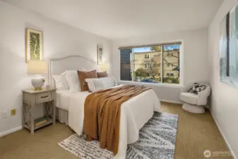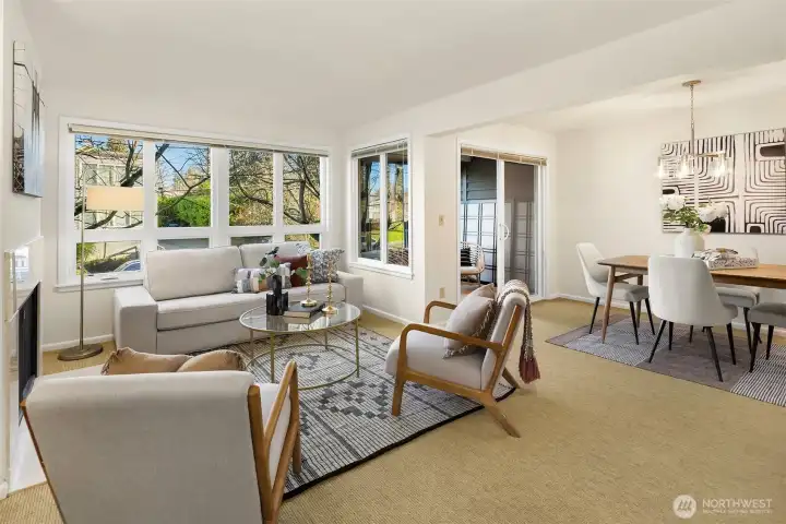 RARE - zero stair entry condo in boutique pet-friendly building w/elevator. Freshly painted & move-in ready, this 831 sq ft unit features a beautiful kitchen with eco-friendly Thai Rubber Wood cabinets, custom ceramic pulls, granite countertops & stainless appliances. Cozy wood-burning fireplace, in-unit laundry, & enclosed porch—ideal for a work-from-home office space. The large bedroom offers space for a reading nook & a generous walk-in closet. Enjoy your private access to a big shared patio perfect for entertaining & BBQs. Community perks include secure entry, gated garage parking, bike storage & big storage space. Newer siding & windows & a prime location near U Village, Burke-Gilman Trail, Magnuson Park, UW, and Children’s Hospital.