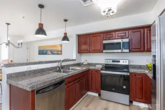 Experience luxury living with breathtaking views of Commencement Bay, the city skyline, Mt. Rainier, and the Tacoma Dome from this stunning 9th-floor condo! This beautifully updated unit features 2 bedrooms, 1.75 baths, luxury vinyl plank flooring, and stylish new light fixtures. The gourmet kitchen boasts granite counters and includes all appliances. Enjoy the sweeping views from the oversized living and dining areas. The primary suite offers a private bath and dual closets. With a separate laundry room, A/C, secure garage parking, and a fitness center, this condo offers it all. Prime location near downtown and freeway access!