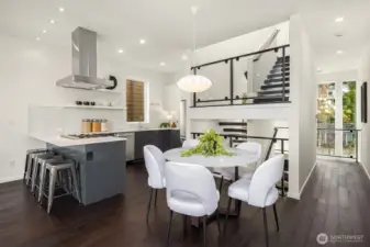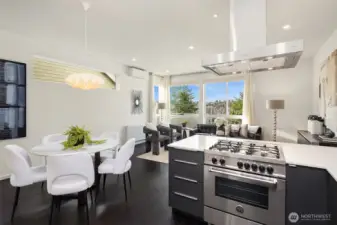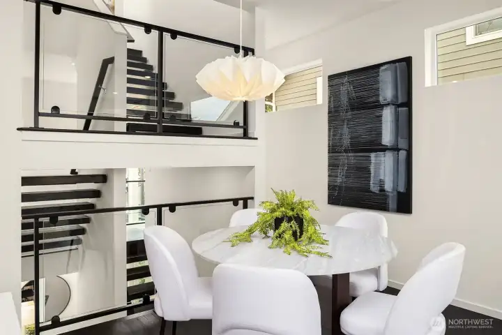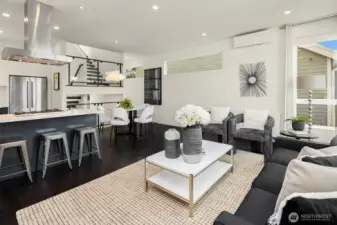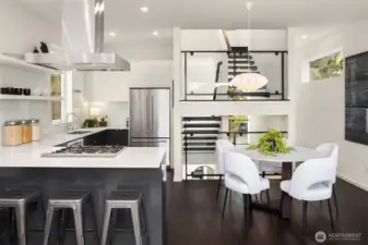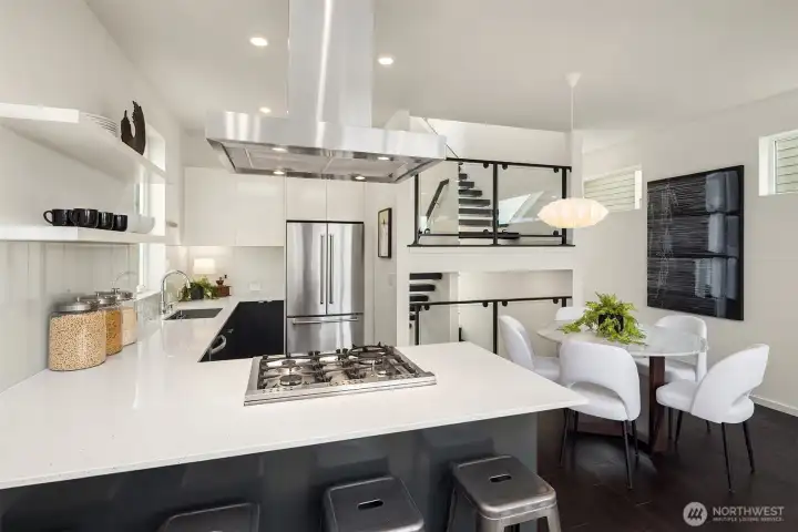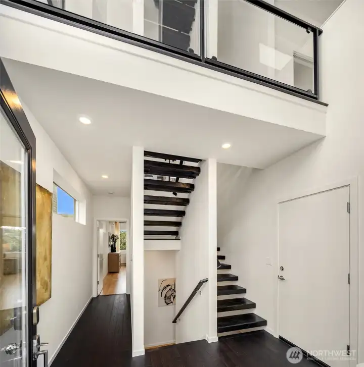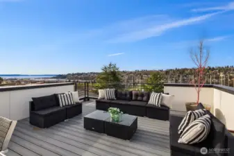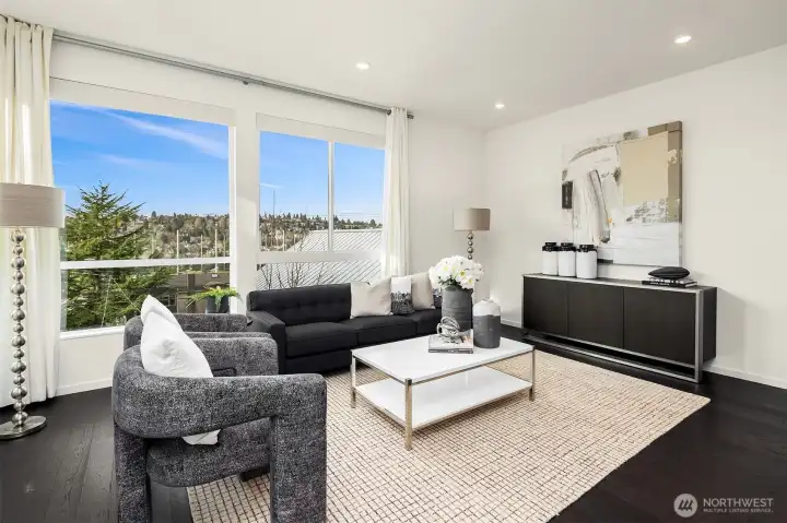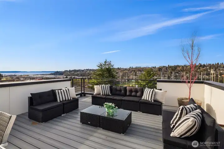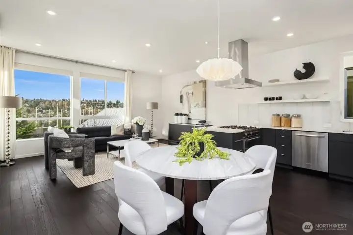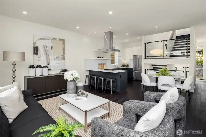 Modern architecture and intentional design converge on Queen Anne, where lofted spaces, sculptural lines, and elevated finishes create a living experience that feels both current and timeless. A dramatic double-height entry gives way to a floating wood-block staircase that connects each level with gallery-like clarity. The main floor unfolds into an open living, dining, and kitchen environment designed for entertaining and daily comfort. High ceilings and expansive walls offer space for art, while wide-plank floors and a soothing palette ground the interiors. The kitchen balances style and performance with a Bertazzoni gas range, french-door refrigerator, quartz surfaces, and open shelving that keeps the composition clean and functional. A separate den/office and powder room round out the main floor. One level up, a 750-square-foot roof deck plays host to a true outdoor living room with sweeping vistas of Elliott Bay. It’s the rare kind of space that invites true indoor-outdoor living: summer dinners, sunset cocktails, or quiet weekend mornings with a book. Programmable Lutron lighting controls allow for custom scenes, while mini-splits provide efficient year-round comfort. The garage is prepped for EV charging with ample built-in shelving. Set on the west slope of Queen Anne, moments to neighborhood cafes and restaurants, parks, Whole Foods, and transit, this home embodies a sophisticated yet relaxed way of living - architectural, connected, and undeniably Northwest.