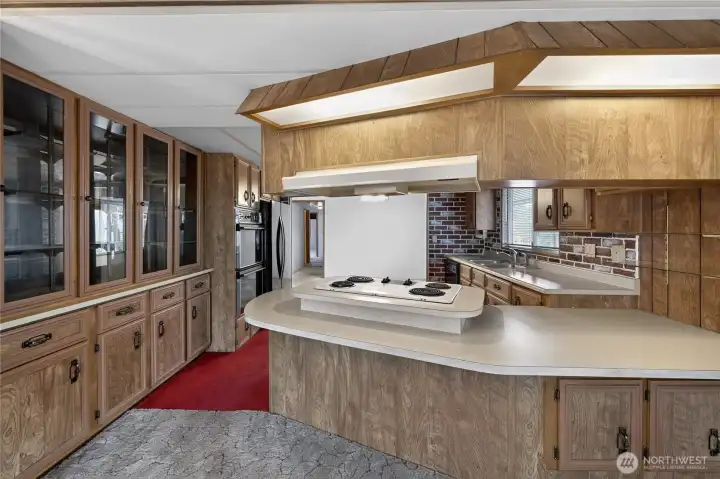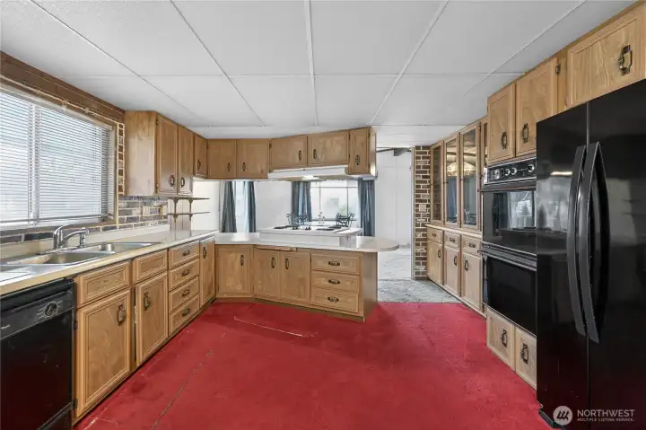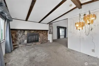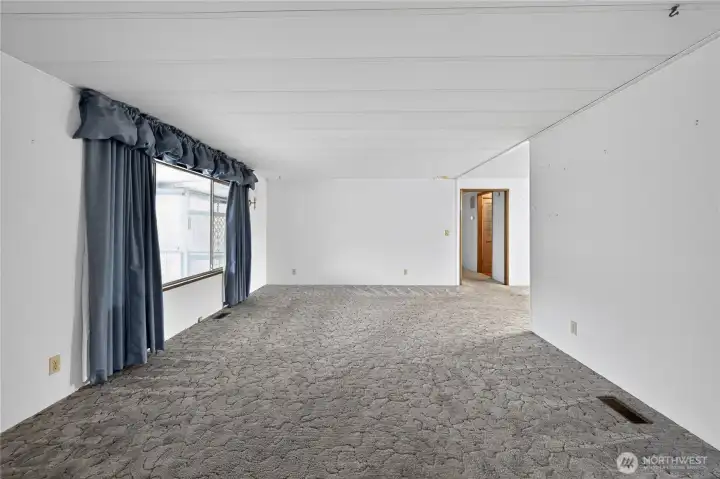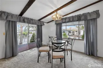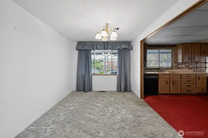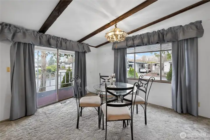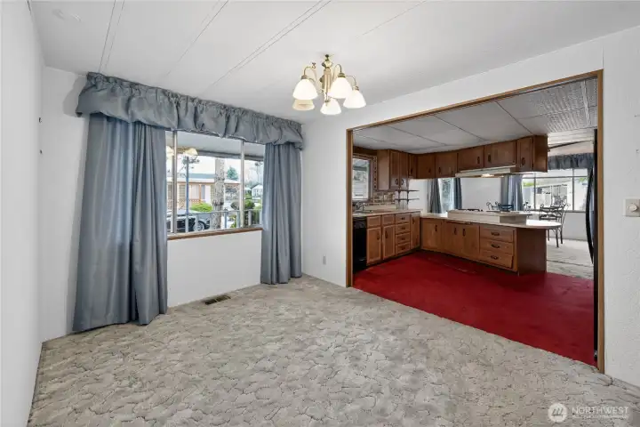 Spacious and comfortable 3BR/2BA manufactured home offering two living areas and two dining spaces, providing flexibility for everyday living or entertaining. The oversized kitchen features generous storage and double ovens. One living room includes a fireplace with fan, while the second offers plenty of room for larger furniture or hobbies. Ramped, no-step entry and a large primary suite add convenience. Located on a corner lot with RV parking, covered carport, and an additional covered front patio. Two storage sheds, including one with workshop space. Well-proportioned layout with great potential, located in Park Village, a welcoming 55+ community.