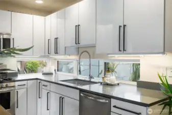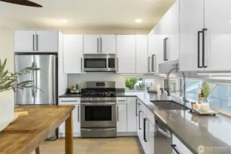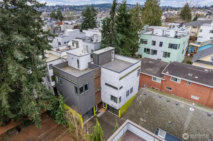 This light filled town home is the one to choose for so many reasons. Your thoughtfully laid out floorplan is tucked behind a house that fronts NW 63rd St creating a quiet private setting. Another plus is that there are just two units here only partially attached on one side. The bedroom on the entry level could easily be your office without going through the private living areas. Two bedrooms, one with an ensuite 3/4 bath, and a full bath share the second level. With light from all sides, including corner windows in the living room, the open kitchen, dining and living room areas will be the perfect space to entertain as the roof top deck flows easily from this fun great room. The kitchen is sleek in design with quartz counter tops and stainless steel appliances. Garage has room for parking and storage plus a dog run in back.