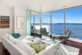 Unobstructed and best views of Seattle from this west facing home. Harbor Island Ferries, Big Wheel, Elliott Bay, Pike Place Market, New Waterfront Park, Aquarium and Olympic Mountains - Seattle's finest! This gracious open floorplan offers complete privacy and is one-of-a-kind. Situated on the 20th floor with the quintessential connection to the locals sauntering in Pike Place Market as well as the views of Elliott Bay and mountains. Your new favorite pastime will be waking up to the ferries and seagull passing by and relaxing in the evening with the sunsets over the Olympics. The primary suite and guest bedroom are facing the water and mountains. No better location when you are at the 50 yard line and front row seats! This customized condominium has thoughtful design enhancements: custom cabinetry in Office/Media room which can be closed off for potential third bedroom. Guest bedroom can double as an office with sliding doors that open the view. Two large parking stalls and generous storage. Option to purchase a wine cellar. Five star 24/hour concierge, 3 rooftops with gardens, BBQ, boardroom, fully equipped gym and yoga studio. Only steps to Seattle's new waterfront park, new Aquarium, Pike Place Market, retail, stadiums and the theater /Arts.
