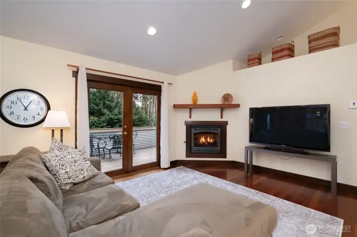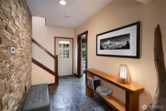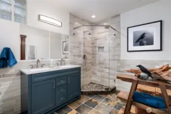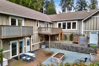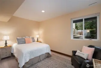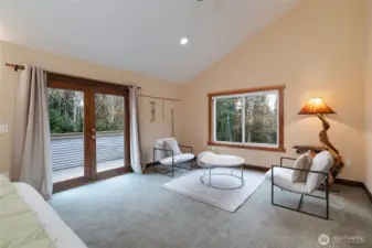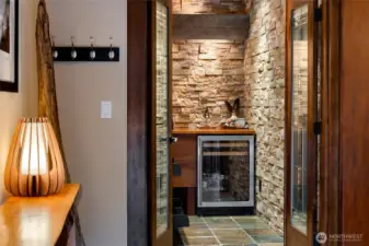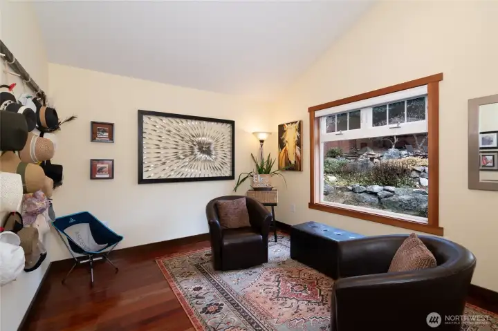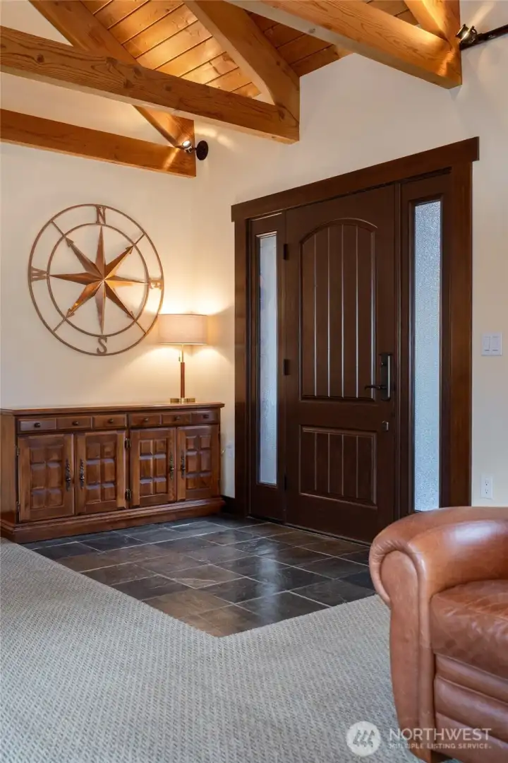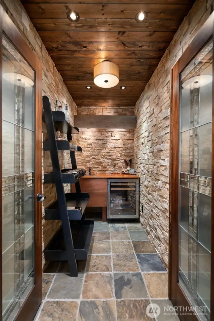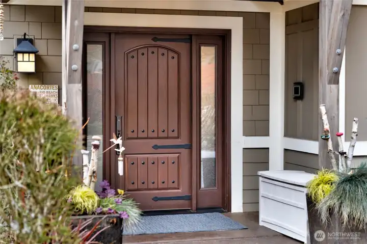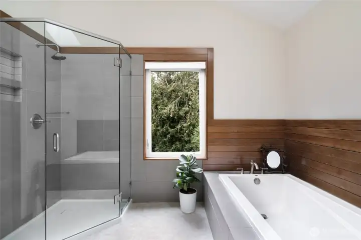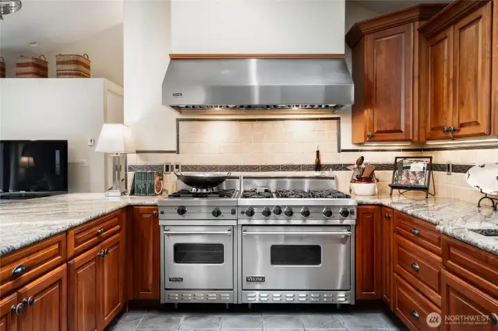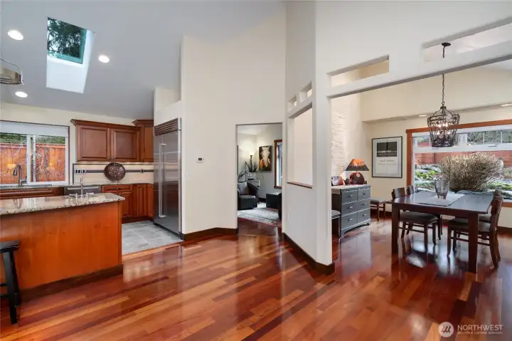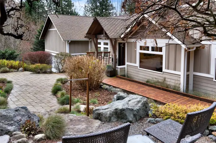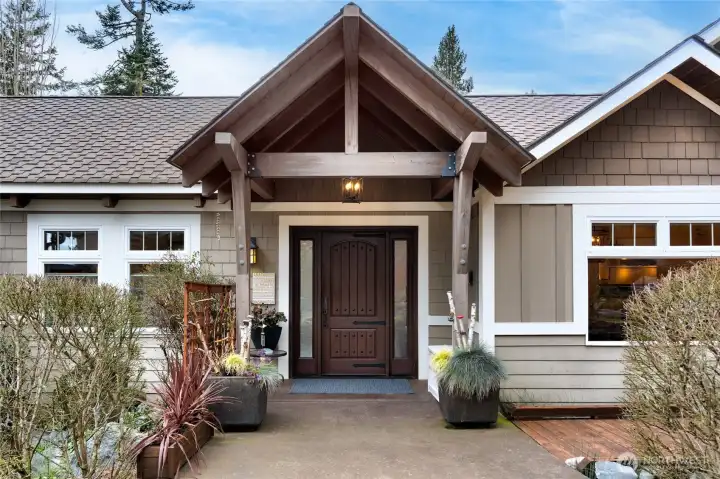 Stunning Pacific NW home showcases elegant cherry floors, creating a warm, inviting atmosphere. The interior is further enhanced by vaulted, wood-lined ceilings in the living rm featuring exposed beams that add a sense of spaciousness & architectural interest. Generous spaces on the main w/living rm, dining rm, den/office, Family rm, laundry & high-end kitchen w/premium appliances, including a Sub-Zero refrigerator & Viking six-burner stove & double ovens. For culinary enthusiasts, there is a dedicated Viking wok burner. Main flr primary suite is perfect for relaxation & comfort. Downstairs features slate tile floors, 2nd primary suite w/ensuite bath, 3rd bdrm, bonus rm & custom wine cellar. The .42 of an acre is a retreat for the senses.